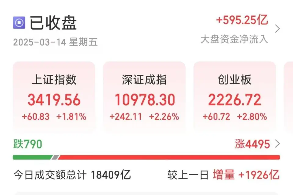 3月14日,A股三大指数放量反弹,上证指数收报3419.56,涨1.81%,在重返3400点的同时创下年内新高。深证成指收报10978.30,涨2.26%,创业板指收报2226.72,涨2.80%。全市成交额18409亿元,较上一生意业务日放量1926亿元;大盘资金净流入597.10亿元。全市个股呈普涨态势,上涨个股4495支。 上证指数收报3419.56,涨1.81%,在重返3400点的同时创下年内新高。