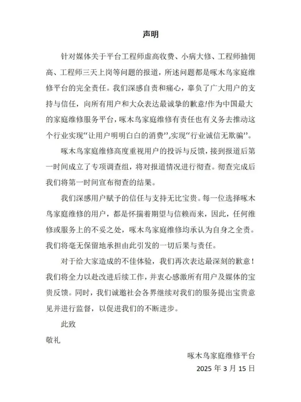 3月15日,2025年央视315晚会曝光一系列行业乱象。此中点名,啄木鸟家庭维修平台无病乱修、小病大修、乱收费,坑骗消耗者。 16日破晓,啄木鸟再回应被315晚会点名称,全体管理层决定:放弃公关。声明称,这件事没有公关可做,没有任何表明可以让统统回到已往。公司将天天发布一条整改声明,天天公开一项整改希望,直到全部题目被彻底办理。 然而,对于啄木鸟的回应,一些网友显然并不买账。 此前,啄木鸟曾在15日晚发布致歉声明。 据央视消息消息,针对重庆啄木鸟网络科技有限公司无病乱修、小病大修、乱收费,坑骗消耗者的情况时有发生的题目,重庆市市场监督管理局构造市区两级执法气力,出动执法职员80余人,进驻重庆啄木鸟网络科技有限公司总部及其分子公司,重点对维修工的抽成规则、员工培训、对外宣传、业务推广、零配件产品格量等情况举行观察。执法职员现场提取了重庆啄木鸟网络科技有限公司一样平常策划运动及业务往来的部门证据资料。 同时,团结重庆市计量质量检测研究院对其子公司——重庆百家家维电器有限公司库房内的干系产品开展质量监督抽查。在库房内发现存放有燃气软管、LED平板灯、电机三种涉嫌无3C逼迫认证的产品,执法职员现场对上述产品采取了扣押逼迫措施。 3月15日晚9:10,上游消息记者随重庆市市场羁系局和两江新区市场羁系局赶到“啄木鸟”所在的写字楼大厅。随即,执法职员兵分几路,对“啄木鸟”办公场所所在的5个楼层举行观察取证。 据红星资本局,高比例抽成是导致啄木鸟维修乱收费、代价虚高且不透明、小病大修等题目的告急缘故原由。啄木鸟维修在订单上的收入占订单付出总金额的约40%,这一抽成比例相较于其他维修平台高出两到三倍。 作为2024年1月、10月两度向港交所递表的维修平台,啄木鸟维修的财报体现实在相当不俗:2021至2023年,该公司营收分别为4.01、5.95、10.11亿元,2024年上半年营收6.23亿元,同比增长率45.07%;更令人咋舌的是,其上述三年的毛利率分别高达80.5%、81.4%和84.2%,堪称精简高效的红利呆板。 啄木鸟家庭维修首创于1995年,首创人兼董事长王国伟从一线维修工人开始其职业生存。如今,啄木鸟提供的服务已覆盖逾300个重要家电和家居办法种别,包括家电维修、防水补漏、家具维修以及电子产品(如手机及条记本计算机)维修等。2023年前9个月,啄木鸟平台总买卖业务额约为人民币17.9亿元,较2022年同期增长65.7%。 值得留意的是,2017年,小米团体控股的孙公司天津金米投资合资企业(有限合资)、雷军旗下的顺为资本以及58同城首创人姚劲波持股88.89%的云企互联参与了啄木鸟维修万万级人民币的A轮投资。 从招股书来看,作为一个发展时间并不算长的互联网平台,啄木鸟维修得以快速实现增长的重要缘故原由在与高抽成与重营销的发展模式——除了此条件到的40%订单团体抽成比例外,据媒体报道,由于抽成较高,许多工人为了赚取更多收入,不得不报高于市场价的费用大概采取其他本事举行乱收费。 需要指出的是,和当前许多互联网用工新业态的情况雷同,啄木鸟平台上的工程师们亦并非公司雇员或分包商,而是与平台签署合作协议的业务合作关系。在招股书中,啄木鸟维修将平台上的工程师称为“我们的客户”,并表示其向工程师提供平台服务,促成其与消耗者之间的有关家庭维修服务的买卖业务。 而与高毛利和高抽成相对应的,则是啄木鸟高涨的营销费用。在表明公司净利润由2023年前6个月的4150万元淘汰至2024年同期3890万元的缘故原由时,啄木鸟维修表示,重要是由于平台上服务订单增长,贩卖及营销费用大幅增长。 根据招股书数据,公司每年在营销上的投入险些为营收的半数,2021至2023年及2024年上半年,公司“贩卖及营销开支”分别为1.78、2.91、4.94和2.99亿元,分别占当期营收的44.3%、48.9%、48.9%和48%。 其特别提到:“我们能否保持或低沉贩卖及营销开支在服务订单总买卖业务额中的占比,取决于我们能否提高贩卖及营销效率,并依附我们现有的品牌价值及杰出的消耗者体验得到口碑转介。” 对平台上的工程师来说,若想要赚得更多,要么接单量多,要么买卖业务代价更高。而家庭维修则刚好是一个缺乏标准化服务的行业,存在维修过程不透明、服务代价不透明、服务质量差异一等题目。 对于这个题目,啄木鸟在招股书中也有提及:啄木鸟创造了独有的服务即产品(SaaP)模式,将复杂的买卖业务流程及因人而异的非标准的服务需求分为边界分明的模块,工程师在服务前、服务中及服务后均可按照该等模块举行利用。通过在整个服务链中实行SaaP模式,实现了服务范围和服务代价的透明化、服务交付的标准化、以及质量包管的体系化。 但即便云云,啄木鸟的投诉量仍不绝较多。 招股书表现,2021年-2023年以及2024年上半年,啄木鸟分别收到约20.7万宗、23.9万宗、44.2万宗及45.3万宗来自买卖业务消耗者的投诉,其投诉大部门与代价或对服务订单的回应有关。 啄木鸟在招股书中披露,其将工程师视作客户,而并非公司的雇员大概调派员工,这意味着双方没有劳动或雇佣关系。 起首,啄木鸟会收取合作工程师的保修押金。保修押金于每位工程师开始使用平台时收取,通常介乎3000元至20000元,视工程师提供的家庭维修服务范例而定。截至2021年、2022年及 2023年12月31日以及2024年6月30日,来自工程师的保修押金结