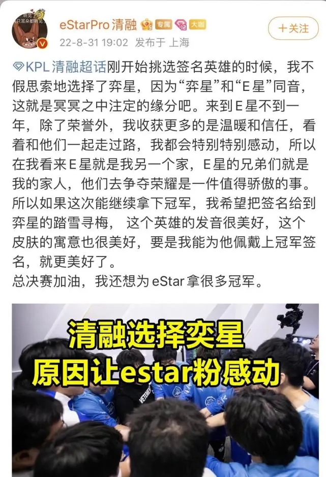 陌陌聊游戏,给您带来精彩猛烈的KPL赛事资讯! 2022年KPL夏日赛末了一场比赛,是eStar和狼队的总决赛!这场比赛得胜的战队,将会成为首届夏日赛的冠军战队! 如果的eStar得胜,那么eStar将连续拿到四个冠军,完成史无前例的四连冠;而如果是狼队得胜,狼队这拿到战队汗青上的第七个冠军!就算没有这些条件,这个冠军对于两支战队来说,也会争得不可开交! 为了增长选手的潜力,为了让总决赛不再出现4比0的情况,官方也是费尽了脑汁!这不,在总决赛的比赛前,官方拿出了非常鼓励的选手的方案。给拿下冠军战队的五个首发,拥有一款皮肤的署名权! 不得不说,这个方案的出台,对于选手们来说,好坏常“打鸡血”的!KPL的汗青上,还从来没有出现过可以或许在皮肤上署名的选手,这对于选手们来说,好坏常冲动的! 方案出来之后,两支战队的选手都在挑选出自己的好汉皮肤,飞牛选择的是花木兰的猎龙者,坦然选择的是吕布的机甲兵士。此前,eStar的清融还没有决定选择哪个好汉,不外网友们大多以为,清融应该会选择不知火舞,究竟清融被称为“火舞王”! 但是,当网友们看到了清融选择的好汉后,除了感到惊讶之外,就是为他感到开心!清融选择的好汉是奕星,皮肤是奕星的伴生皮肤! 清融体现,在选择好汉的时间,他绝不夷由的选择了奕星!为什么呢?以为你奕星和“E星”同音!这就是冥冥之中的缘分,来打eStar不到一年,除了荣誉之外,清融劳绩更多的是温暖和现任!对于清融来说,选择eStar就是他另一个家了!而清融也渴望可以或许为eStar拿到更多的冠军! 确实,当清融刚来eStar的时间,一开始打得并欠好,其时清融还由于打不外在台上哭了出来!是eStar的选手们不绝在旁边安慰他,终极让清融快速的找到感觉,找回顶峰状态! 清融说,eStar是他的另一个家,也就是说,在清融的内心,Hero久竞只是一个“站点”而已!此前,就有网友爆料,清融在Hero久竞的时间,好坏常不得志的,以致还被无畏到处欺凌!在一场比赛竣过后,无畏对清融的拉扯动作,着实好坏常大略! 大概清融这段对eStar感情的表达,也从另一方面实锤了他和无畏的反面!不外统统都已往了,现在在eStar,我们看到了自大满满,开开心心的清融! 清融找到了他的冠军好汉皮肤,那么你们有没有自己非常喜好的一款皮肤呢?陌陌对于项羽的“霸王别姬”这款皮肤还好坏常喜好的!最大的缘故因由就是,这款皮肤突出了中国的文化。 这款皮肤近来也完成了优化,同时完成优化的尚有虞姬的皮肤!两款皮肤优化之后,更加有寄义和味道了!这款皮肤不久将会返场,各人不要错过哦! |