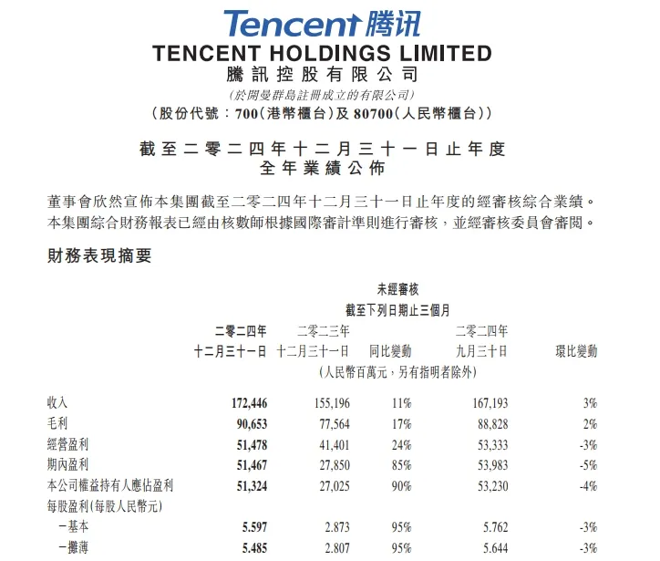 每经编辑:张锦河 3月19日,腾讯控股在港交所公告,2024年整年,实现营收6602.6亿元,同比增8%;净利润1,940.7亿元,比上年增长68%;NON-IFRS净利2227亿元,同比增41%。 第四季度营收1,724.5亿元人民币,同比增长11%,市场预估1,687.4亿元人民币;第四季度调整后净利润553.1亿元人民币,同比增长30%。 公告称,2025年,建议增长年度股息32%至每股4.50港元(约即是410亿港元),并筹划至少回购代价800亿港元的股份。 2024年国际市场游戏收入为人民币580亿元,按呈报及固定汇率盘算的增幅均为9%,得益于《PUBG MOBILE》及 Supercell游戏的强劲表现。本土市场游戏收入增长10%至人民币1,397亿元,得益于《无畏左券》、《火影忍者》、《金铲铲之战》及《好汉联盟手游》的收入增长,以及《地下城与勇士:劈头》与《三角洲行动》的新收入贡献。 第四季,本团体产生的自由现金流为人民币45亿元。此乃策划活动所产生的现金流量净额人民币540亿元,被支持我们AI项目发展所涉及的资源开付出款人民币390亿元、媒体内容付款人民币85亿元及租赁负债付款人民币20亿元所抵销。 腾讯控股披露,于2024年12月31日,团体有110558名雇员。腾讯在公告中表示,团体定期审阅雇员的酬金政策及团体酬金。除退休金及内部培训课程外,雇员可根据个别表现评核而酌情获授花红、嘉奖股份及购股权。团体制止2024年12月31日止年度的总酬金资本为人民币1128亿元。 2024年整年,研发投入约707亿元,此中紧张包罗员工福利开支约人民币560.61亿元。 据媒体报道,腾讯董事会主席兼首席实行官马化腾表示,“数月前,我们重组了AI团队以聚焦于快速的产品创新及深度的模型研发、增长了AI相关的资源开支、并加大了我们对原生AI产品的研发和营销力度。我们信赖这些加大的投资,会通过提升广告业务的服从及游戏的生命周期而带来一连的回报,并随着我们个人AI应用的加快遍及和更多企业接纳我们的AI服务,创造更久远的代价。 制止3月19日港股收盘,腾讯控股下跌0.18%。 逐日经济消息综合自证券时报、公开信息 免责声明:本文内容与数据仅供参考,不构成投资建议,利用前请核实。据此操纵,风险自担。 逐日经济消息 |