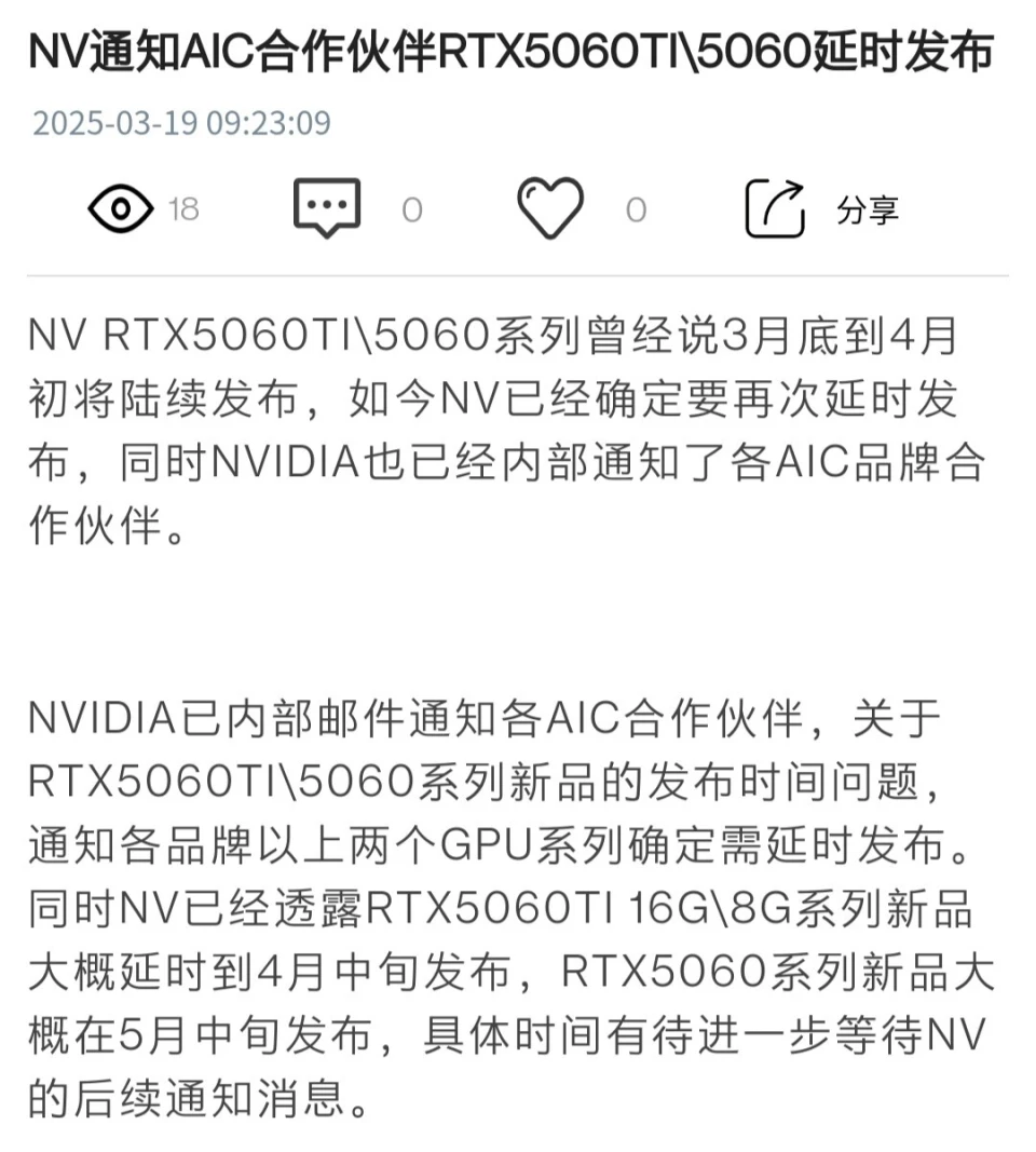 IT之家 3 月 20 日消息,据博板堂本月 19 日发布在视博合聚渠道的消息,英伟达已向各 AIC 显卡制造商通知,GeForce RTX 5060 Ti / 5060 显卡的发布从 3 月尾~4 月初延至 4 月中旬起步。 此前有风闻传出,英伟达预计会在本周(GDC 2025 游戏开发者大会和英伟达 GTC 2025 峰会)前后发布这两款显卡,不外直到如今英伟达官方都没有正式动作。 博板堂消息源表示,英伟达透露 RTX 5060 Ti 16GB / 8GB 大概延至 4 月中旬发布,而 RTX 5060 则要再晚上一个月,“具体时间有待进一步等候 NV 的后续通知消息”。