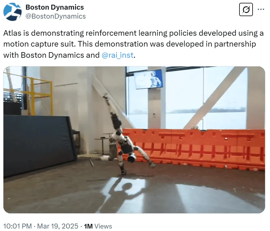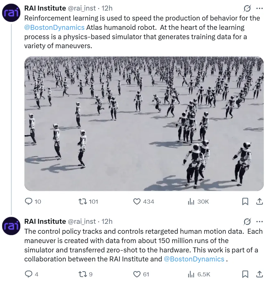 昨天,宇树呆板人发布了一段视频,公布初次让人形呆板人实现了侧空翻,吸睛无数。 而就在这段视频发出后不到 12 小时,波士顿动力也发布了一段视频,此中不仅同样演示了呆板人侧空翻这一动作,还表演了别的看起来非常近似人类的动作。 网友惊呼:这是美国对宇树和众擎呆板人的回应。 也有网友表现,其动作的流通水平超乎想象,更有人说 Atlas 的动作比作为人类的他还更加机动。 到底行不可?咱们将动作分解开来看看: 视频一开始,呆板人先表演了一个「没事儿走两步」,徐徐入场。 掉转头,它忽然开始加速跑: 忽然就开始昏暗爬行: 之后又是一个好像有点站不稳的战术翻滚: 请留意接下来这个向前翻的动作,Atlas 必须用双手撑住地面,才敢开始下一步动作: 看了好几遍之后,总以为哪里怪怪的,调成 0.5 倍速才发现,它只有下半身翻过来了,上半身还是原先的方向…… 对比前几天众擎家的「前空翻」: 开始尬舞了,这似魔鬼的步调: 有人打趣道,它的轰隆舞动作至少不是天下上最糟糕的表演。你可能还记得,在客岁的巴黎奥运会上,澳大利亚选手 Rachael Gunn 的「跳大神级」表演: 最终,她得到了 9 位裁判中的 0 票支持,输掉了比赛却赢得了广泛的知名度。 如果我们将 Atlas 奉上奥运赛场,Rachael Gunn 又该怎样应对? 末了便是侧空翻,同样与 可以看到,波士顿动力 Altas 在实行侧空翻动作时同样使用了双手撑地这个动作(严格意义上这已经不能算是「空翻」,只能算是侧手翻),而 G1 则完满是凌空侧空翻。至少从这一点看,宇树 G1 要更胜一筹。 强化学习至关紧张 波士顿动力表现,Atlas 演示的是「使用动作捕捉服开辟的强化学习战略」。而该战略是波士顿动力与 RAI Institute 一起互助开辟的,而后者的「任务是办理 AI 和呆板人领域最紧张和根本的困难」。 RAI Institute 则在自家 账号上分享了轻微更多一些细节。 这家公司表现,强化学习的作用是加速波士顿动力 Atlas 人形呆板人的活动天生。其学习过程的核心是基于物理的模仿器 —— 它可以为各种动作天生训练数据。 比如匍匐进步: 一连侧空翻 + 后空翻 又大概举门而入(从这个模仿呆板人扭动的环境看,这门应该挺重的): RAI Institute 表现其控制战略是通过跟踪和控制重新定位的人体运动数据构建的,而且每个动作都起首让模仿器运行了约莫 1.5 亿次,并可以零样本地传输到硬件 —— 也就是说无需再在硬件上继承训练或调解。 我们知道,现今推理模子的成功就离不开强化学习,而强化学习也已经开始在更多领域开疆拓土,比如白质折叠和药物计划、芯片计划自动化等等。 对于这段视频预示的未来,你做好准备了吗? |
