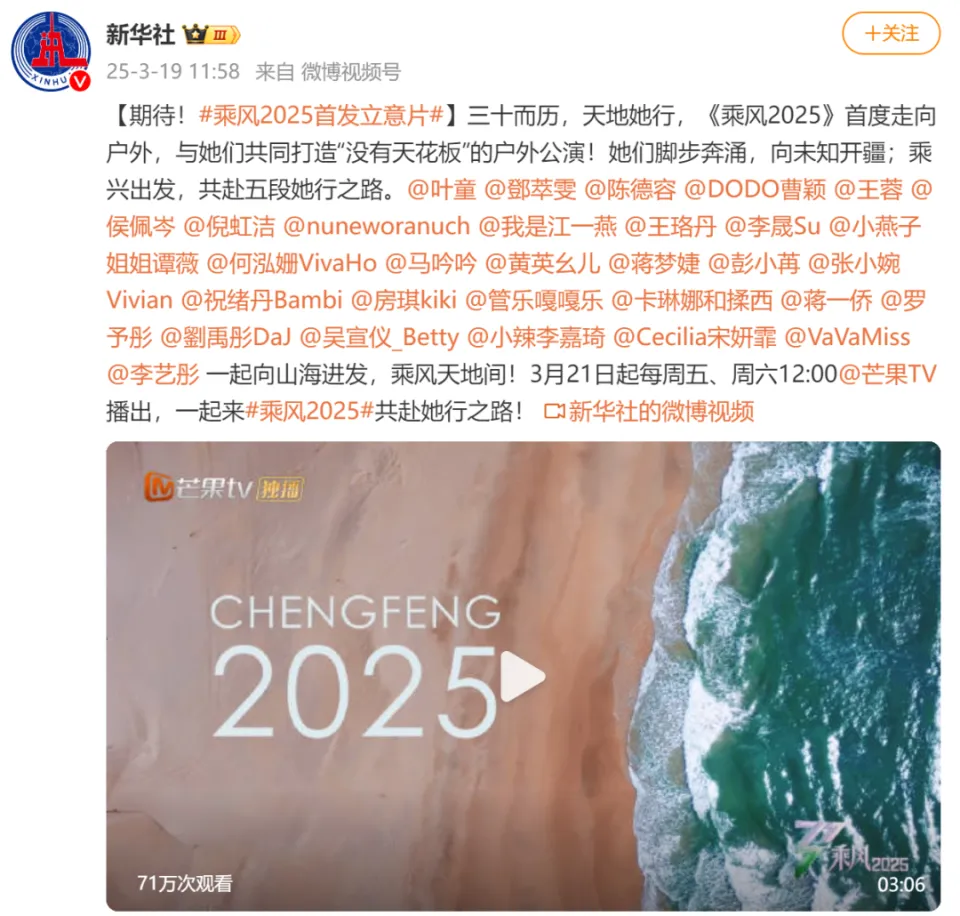 3月20日晚,张杰为谢娜乘风见证人打call,甜蜜表明:“你更好……我一直见证着你的见证。” 3月20日,谢娜官宣《乘风2025》见证人。 3月19日,热门综艺节目《乘风2025》首发立意片:三十而历,天地她行。据悉,《乘风2025》首度走向户外,与一众姐姐共同打造“没有天花板”的户外公演。 此次,节目也首次官宣了高朋阵容,分别有:叶童、邓萃雯、陈德容、曹颖、王蓉、侯佩岑、倪虹洁、泰国当红女星nuneworanuch、江一燕、王珞丹、李晟、谭薇、何泓姗、马吟吟、黄英、蒋梦婕、彭小苒、张小婉、祝绪丹、房琪、管乐、卡琳娜、蒋一侨、罗予彤、刘禹彤、吴宣仪、李嘉琦、宋妍霏、VaVa、李艺彤。 潇湘晨报综合报道 报料、维权通道:应用市场下载“晨视频”客户端,搜刮“报料”一键直达;或微信添加报料客服:xxcbcsp;或拨打热线0731-85571188。如需内容合作,请拨打政企服务专席19176699651。 |