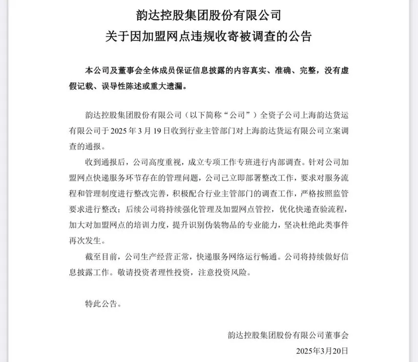 作者|江上酒 编辑|文定 “315”刚过,韵达就失事了。 3月19日晚,国家邮政局官方发布文件,韵达因涉嫌诈骗宣传品进入寄递渠道,被依法备案观察。 3月20日,韵达官方敏捷给予复兴,并体现已经建立了内部观察组,积极共同整改。固然及时自查,但是这起事件仍对韵达造成不小影响,公告发布后两个工作日内,韵达股价累计下跌了3.89%。 派代留意到,韵达不是第一次被官方处罚。上一次是在2024年4月,其处罚原因是义乌某加盟点违规售卖斲丧者退件,后该网点被取消,并予以了罚款处置处罚。 值得留意的是,韵达这次的违规,在性子上与前次有很大的差别。 在国家邮政局的官方的转达中提到,在本次的违规中,有部门斲丧者遭受了“重大财产丧失”,据派代网络资料体现,斲丧者丧失的金额在几百元到几万元不等。至于责任该怎样判断,还需等待官方的告示。 电商财产发达了十几年,快递财产也随之扶摇而上,可多年以来,快递行业的乱象始终不止,乃至还出现出了愈演愈烈的势头。 黑猫投诉平台体现,在2024年,物盛行业整年的投诉高达20万起,而其中信息泄漏是重灾区,占比高达37.99%。 快递行业为何频频曝出乱象?这背后毕竟是平台管理的缺失,亦或是加盟商被“层层压榨”后的必然效果?今天派代便想借韵达这起事件,谈谈我们对快递财产的见解。 快递工作职员,为何甘愿沦为诈骗“帮凶”? 起首,我们来盘货一下整件事的委曲。 据公开信息体现,在已往的几年时间里,北京、湖南、浙江、深圳等地出现了一大批诈骗工作室,而他们对准的目的,就是快递网点。 他们每每会将本身伪装成“大客户”的人设,与网点告竣合作,而后在发出去的包裹中塞入各式各样的诈骗卡片,而快递站则会以每单0.05元的“提成”,对这些题目包裹予以放行。 韵达事件曝出以后,有很多网友体现,终于明确那些“空包裹”是怎么来的了。 近来几年,常常会有斲丧者收到一些“空包裹”,内里大概是一双筷子,或是一些小东西,并附上一张返现的卡片,但这些快递并非他们所买,现在看来,大概率是快递网点与诈骗工作室合作的效果。 而据派代网络的资料,也佐证了一个究竟,这些“诈骗快递”的生意是否能成,很洪流平上取决于快递网点工作职员的态度。 本年1月份,据浙江邮政管理局发布的公告体现,苏溪韵达的司机在运输包裹时,发现了其中的“猫腻”,随即上报主管部门,终极乐成拦截了一大批“诈骗快递”,共计17244单。 而在2024年3月份,山东滨州警方查处的一则案件中,在短短4天内,快递员工就团结诈骗工作室发出了5万多单携有诈骗信息的包裹。 整日经手那么多快递,纯熟的快递员,自然能一眼看出其中的猫腻,可为何会选择“视而不见”呢? 由于就算是圣贤,同样也必要“吃饭”。 对于不少中小商家而言,韵达简直是个很不错的选择,来由也很简单粗暴,那就是“自制”。 2025年1月,韵达单票收入仅2.02元,同比降落11.01%;2025年2月,单票收入进一步跌至1.95元,同比降落14.85%,创汗青新低。 与之对比,顺丰单票收入是15.61元,圆通是2.35元,申通是2.06元,在同业者中,韵达的单票标价是最自制的。 但在商家与韵达的合作中,商家的策划资源固然降低了,背后却是韵达末端网点的策划逆境。 据业内人士分析,在2元的单票收入根本上,末端网点的每单利润只有0.1-0.2元左右,在云云有限的利润内,还要付出房租,职员工资,这使很多网点都在红利的边沿上挣扎。 自2023年起,闲鱼等二手平台上开始出现大量快递网点转让的信息,固然报价在几万到几十万不等,但却有价无市,大部门无人接盘,终极只能宣告倒闭。 这么看来,假如每单“副业”可以或许给每单带来0.05元的利润,真的并不算少了。 这也不禁让人感慨,原来全部的“铤而走险”背后,多多少少都会有些“难言之隐”。 就像2024年4月,韵达义乌网点被曝出倒卖退货的事件一样。该网点会把斲丧者的退件网络起来,标上盲盒的标签,举行二次售卖,他们的目的,也是为了增长营收。 固然,我们也不能将其当做违法违规的“挡箭牌”,毕竟从举动本质上就是错的,就应该予以处罚和整治。 可这也延伸出一个更加根本的题目,那就是快递网点利润低的困难,真的没办法办理么? 加盟商生存困难,违规策划成为“灰色常态” 有题目的,着实也不止韵达一家。 3月7日,据汹涌消息报道,北京某位寄件人在寄件时,接到了快递员的两次通话,体现私下下单会更自制,末了却发现快递员在两次收件时都虚报重量,多报了80斤重量,多收取了424元。 3月13日,据红星消息曝光,北京有两家二手奢饰品商家与顺丰的快递员勾结,让快递员拿到货物以后,开箱对商品举行恶意破坏,实现“二奢商家”压价的目的。 这不禁让人发出疑问,快递网点为何乱象频出?以韵达作为案例切片,派代大抵总结了以下三个原因。 1)加盟商规模大,监管难度高。 据韵达财报体现,2024年,韵达业务量创下新高,突破了238亿,日处置处罚包裹高达6500万票,天下共有4884个一级加盟商,末端门店更是高达9.4万个。 面对云云大的快递规模,以及数目浩繁的末端门店,纵然有了数字化体系的加持,地区督导的压力也很大,想要做到完全没有“丧家之犬”,确实很难。 2)加盟商策划难,快递公司策划也难。 前面我们提到了,加盟商的策划处境黑白常难的,每单只有0.1-0.2元左右的利润,但同样的,快递公司策划也很难。 从韵达2024年的策划效果上来看,前三