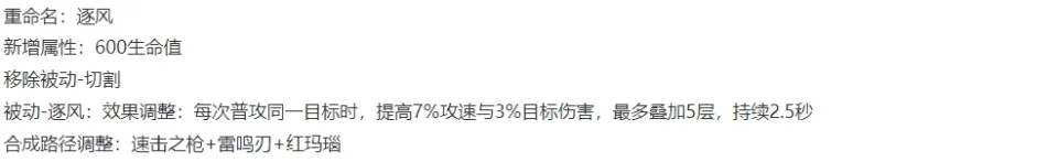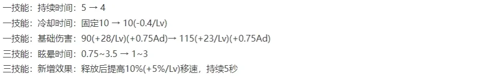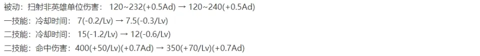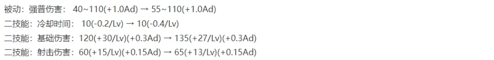 ⑨铸梦·逐风 【解读】铸梦·逐风则会正式改名为逐风,不但新增了600点最大生命,尚有了全新的被动。 逐风的新被动,可以在普攻打同一目标时,提拔7%攻速+3%伤害,最高5层,别的,哪怕是中途转移目标,也执偾会掉1层。 如上图所示,我用虞姬来回切换攻击目标,底下的层数也不绝在4跟5之间切换,换句话说,只要攻速够快,是可以全程保持15%伤害增益的。 实在,逐风重做的目的,也是降低射手对暴击的依赖,让他们可以选择更直接的增伤方式来输出,但相比之下,我以为更适正当球流。 好比,狄仁杰就可以把寒霜侵袭换成逐风,毕竟S39新赛季的寒霜侵袭会取消法球增益,已经不再是法球流的标配了。 【好汉调解】 ①鲁班七号 【解读】鲁班七号主要降低了二技能的CD,前期少了3秒。 固然二技能伤害有所变低,一技能CD也高了点,但思量到二技能是保命+收割的手段,总体照旧赚的,最少鲁班七号前期不再那么容易被切了。 再加上影刃+逐日+破晓都提拔了Ad,而Ad也能转化为扫射比例。 如许算下里,S39新赛季的鲁班七号真的有点香了。 ②敖隐 【解读】敖隐取消了二技能对非好汉单元的回血限定,算是小增强,用处并不是很大。 ③莱西奥 【解读】莱西奥二技能少了1秒,保命本事变强了一点,以后打团也可以多用烟雾弹,来资助队友隐蔽视野了。 ④戈娅 【解读】戈娅重点提拔强普+二技能的伤害,目的是为了增强她的对线期,让戈娅可以更好的对位压制。 别的,二技能的满级CD也低了1秒,保命本事同样有所提拔。 ⑤艾琳 【解读】艾琳提拔了一技能的伤害,目的是为了方便她清兵+斲丧,更好的撑过前期劣势期。 同时,每100Ap提拔的移速,也可以在满级时多15点,换句话说,不管什么出装的艾琳都是有所增强的。 但我以为Ap的增强力度要更高一些,毕竟移速显着更加贵重。 ⑥李元芳 【解读】李元芳的视野被动,到满级时会少2秒CD,一技能提拔普攻的射程也会拉高25点。 至于代价,则是被动和一技能提拔普攻的射程,前期分别会多2秒CD+少25点,相称于削前期增强后期,目的是为了彻底把李元芳从野区赶回发育路。 ⑦后羿 【解读】后羿一技能降低了1秒连续时间,但CD也在满级时少2秒,同时,伤害尚有10~5%的增幅,算下来是增强。 最紧张的是,三技能的晕眩时间从0.75~3.5秒改为1~3秒,近间隔多了0.25秒,再加上开释后尚有20%移速提拔,足以大幅度降低后羿的生存压力。 别的,重做后的逐风,很得当高攻速的射手,后羿是必然锦上添花的,也值得等待。 ⑧黄忠 【解读】黄忠不但提拔了二技能的层数,最高数值有40%+90%(极限减速),直接让他成为了仅次于鲁班七号的绞肉型射手。 别的,在非架炮(大招)的状态下,对面只要进入了二技能的施法范围,黄忠就能立刻提拔二技能的施法速率。 关注Poker 更快相识新版本变更 |