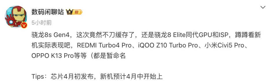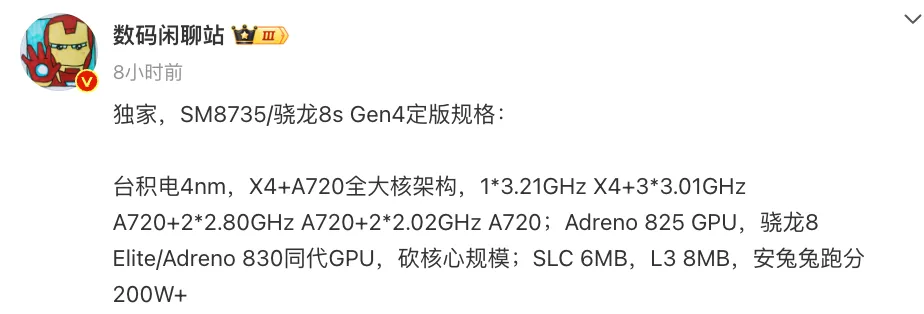 昨日有消息曝光了SM8735芯片的规格信息。 其时的爆料中提到,这颗芯片将基于 4nm 制程工艺,没有接纳 Oryon 自研焦点。 随着时间的推进,博主@数码闲聊站 的最新消息也提到了这颗芯片的细节规格,并给出了产物定名信息。 团结爆料来看,这颗SM8735芯片将被称为骁龙8s Gen4。 其基于台积电4nm工艺制程,X4+A720全大核架构,拥有1个主频为3.21GHz的X4焦点、3个频率为3.01GHz 的A720焦点、2个频率为2.80GHz的 A720焦点、2个频率为2.02GHz的A720焦点,Adreno 825 GPU,骁龙8 Elite/Adreno 830同代GPU,砍焦点规模;SLC 6MB,L3 8MB。其安兔兔跑分能到达200W+。 对比来看,最新爆料中提到的细节信息与此前的爆料根本一致。 同时,这位博主的爆料还提到了后续将搭载这颗芯片的手机产物。爆料中提到:“骁龙8s Gen4,这次竟然不刀缓存了,照旧骁龙8 Elite同代GPU和ISP,蹲蹲看新机实际体现吧,REDMI Turbo4 Pro、iQOO Z10 Turbo Pro、小米Civi5 Pro、OPPO K13 Pro等等(都是暂定名。Tips:芯片4月初发布,新机预计4月中开始上”。 爆料中提到的新机根本上在此前都出现过爆料信息。 据悉,全新的小米Civi 5 Pro或将配备1.5K等深四曲屏,支持光学指纹,内置6000mAh左右的电池,并带来更进一步的影像本事。 团结以往爆料来看,这款新机将搭载前置居中双摄组合,也就是说其将继续主打自拍功能。 同时,这款新机有望接纳左上角圆镜头的后摄模块,并配备影像联名。这也与前代产物的方案靠近。 至于全新的REDMI Turbo 4 Pro,有望内置7500mAh的电池,配备一块6.8英寸左右的屏幕,1.5K分辨率,旗舰同款发光质料,极窄四边框直屏计划。 团结玻璃后盖机身和金属中框,还将率先在中端线遍及高质感CMF,团体的视觉效果和机身质感应该会比力不错。 至于产物订价方面,REDMI品牌总司理王腾曾体现“将来2-3K会由Turbo系列来承接”。就此来看,全新的REDMI Turbo 4 Pro起售价应该在2000元档位。 别的,iQOO Z10 Turbo Pro将内置7000mAh左右的电池,支持120W快充。 其他规格方面,iQOO Z10 Turbo系列将配备6.78英寸左右的1.5K LTPS屏幕。 |