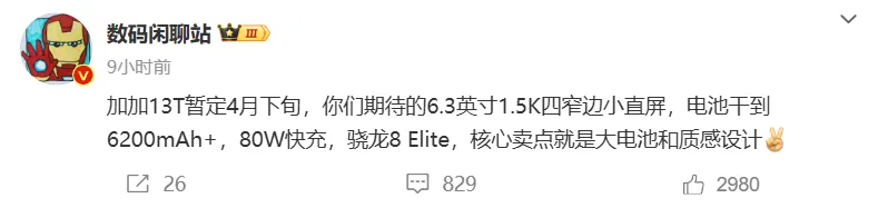 今天,数码博主数码闲聊站在与网友互动中带来了一加 13T 小屏旗舰机型的最新爆料。