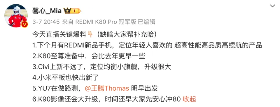 固然3月份的机圈稍显沉闷,但从厂商们的官宣预热、各路民间爆料消息来看。 这边REDMI先是预热了新手机、新平板。 就直接给各人来个「四月新机大杂烩」好了。 小米 一方面是它又要发性价比拉满的新机,另一方面新品也是真的多。 首先是REDMI Turbo 4 Pro。 前阵子机哥具体聊过,这里就简单速通下设置。 续航该说不说,确实拉满了。 表面同样有优化提拔。 团体来看,这机子的定位就挺明确的,主打同价位更好的电池、质感和性能。 我猜一手啊,估计在国补加持下,1899元就能拿下。 固然啦,除了手机,发布会应该还会带上一个14英寸的新平板——「小米平板7 Max」。 14英寸OLED高刷大屏、12000mAh电池+120W快充、搭载澎湃OS 2,这些都属于通例升级啦。 唯一有牵挂的是芯片。