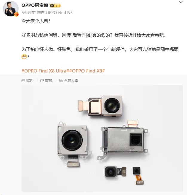 但这一回,可能是Find X8卖得太好了,OPPO真计划来个乘胜追击。 首先是同属于Find X8系列的两台新机—— OPPOFind X8s OPPO Find X8s+ 问就是由于,mini听着不够好听,不够高端。 表面尺寸上,6.3英寸小屏,厚度小于8.15mm,重量小于187g,这也意味着它比小米15和vivo X200 Pro mini都要轻薄。 OPPO给到它天玑9400+、5700mAh以上电池、潜望长焦、无线充和IP68防水。 此中主摄是IMX906,长焦是3.5倍JN5,硬件不超模,但胜在体验够用,跟隔壁vivo X200 Pro mini打法还挺像的。 至于OPPO Find X8s+,大概率是换个天玑9400+芯片,然后把电池加一加就完事儿。 而谁人以影像超大杯形态出击的OPPO Find X8 Ultra。 堆料贼猛,2K超窄四等边直屏、超声波指纹、双大光圈长焦、6000mAh+100W、满级防水+顶级马达...