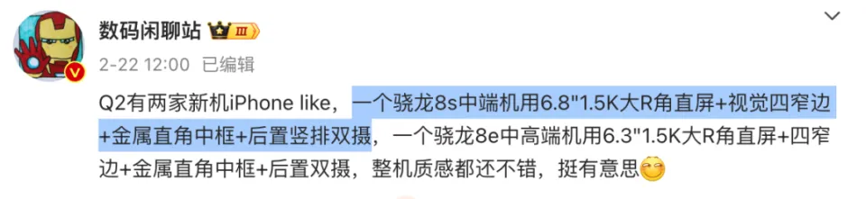 固然啦,作为黑厂的亲儿子。 一加这边也要四月份上新。 这机子同样主打6.3英寸小屏,但和OPPO Find X8s又是差异的打法。 骁龙8至尊版、正面大R角直屏计划、短焦指纹、6000mAh电池、金属中框+玻璃后盖。 然后它表面大概长如许。 影像上的堆料也有,但不多。 IMX906主摄,再加一个2倍的竖立长焦。 能看出一加13T的打法就是:电池最大,最自制的骁龙8至尊版小屏,和OPPO Find X8s形成互补。 vivo 同样是在4月份,vivo这边要发的新机,覆盖了旗舰、中端和千元线下三大价位段。 |