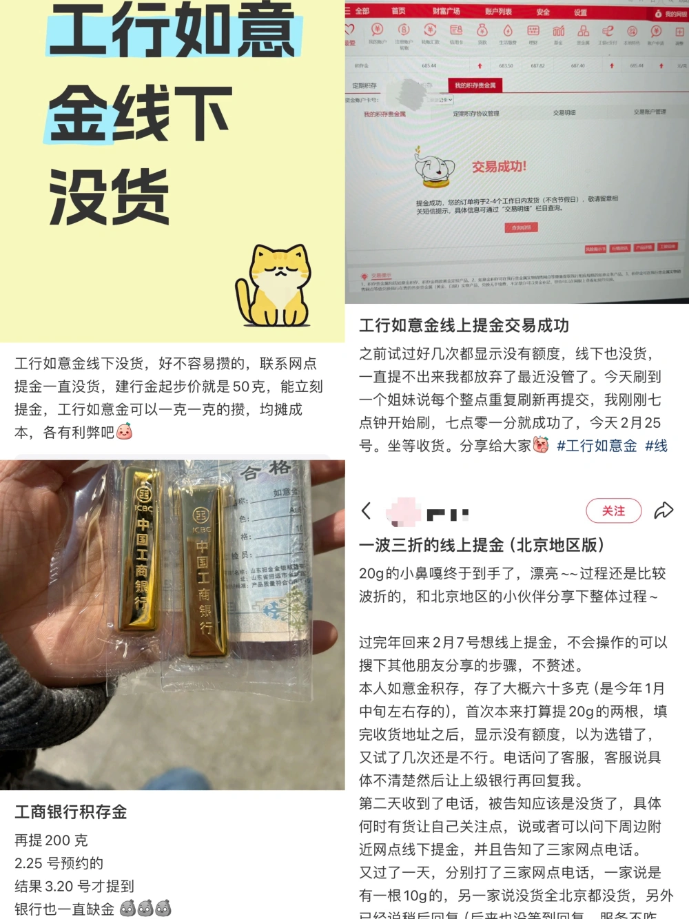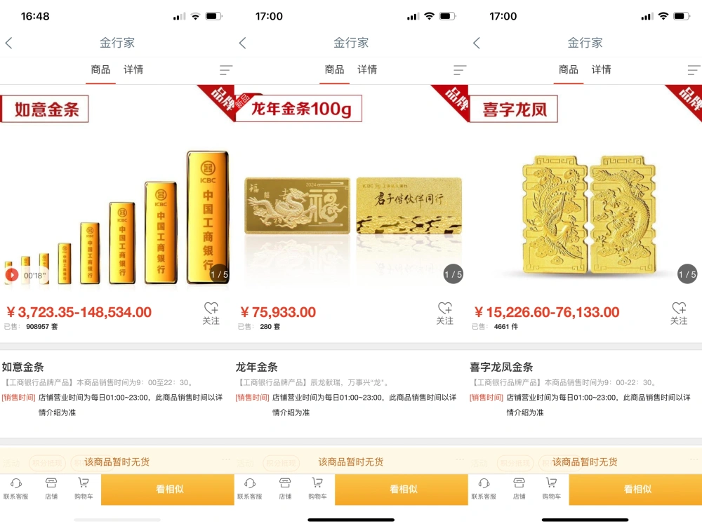 图源:小红书APP网友发帖 “工商银行快意金线下不停没货,好不轻易攒的积存金,接洽网点提实物金条不停没货。”投资者舒郁(化名)向期间财经称,其所在地域工商银行网点小克重实物黄金近期暂无现货。 只管工商银行投资金条供不应求,但其他银行的投资金条仍有库存。建立银行手机App表现,该行投资金条有50克和100克规格,3月31日代价均凌驾747元/克。建立银行北京某支行工作职员透露,手机银行平台仅提供 50 克与 100 克规格的投资金条。近期,网点上架了更小克数浇铸类投资金条,其订价和建立银行手机APP现有投资金条同等 。