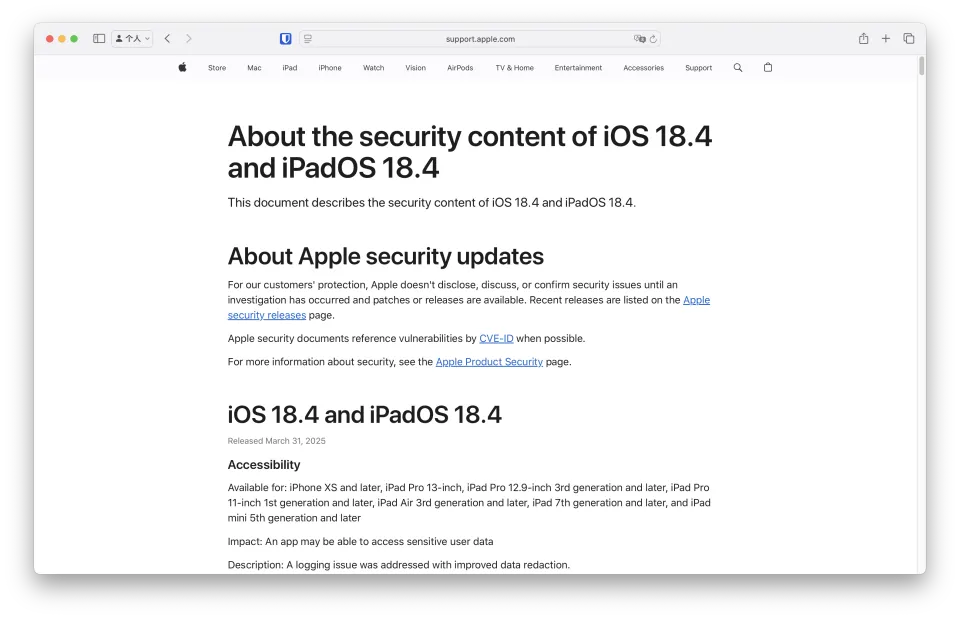 国行 Apple 智能仍需等候只管苹果在 iOS 18.4 中已经为 Apple 智能功能到场了中文语言支持,但这一功能并未在国行版上线。根据消息推测,Apple 智能可能会在 5 月份推出的 iOS 18.5 中推出,渴望不会再推迟。 漏洞修复根据苹果公布的安全文档,iOS 18.4 和 iPadOS 18.4 本次修复了大量已知安全性漏洞,小编数了一下多达 60 项,涉及体系底层框架以及用户常用的苹果应用,如照片、Safari 等,全面提升了体系的安全性和稳固性。 更多变革
