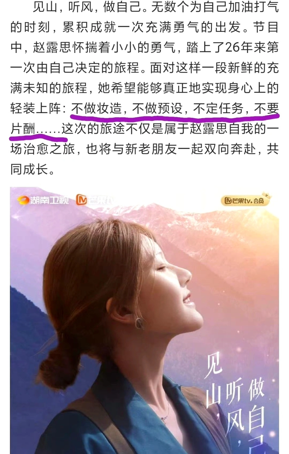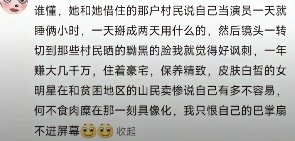 近段时间,赵露思的新综艺刚刚开播,预料之内话题热度高,但负面热门颇多,赵露思在节目中的言论被推上舆论浪尖。 观看当地老人显现传统手艺,对老人说手艺没有传承人,赵露思脱口而出: “你自私了”。 赵露思还体现这种传统手术难过,她平常都要费钱去表面学习才气学到。 “我费钱去表面学”。 看到山区家里的拐棍,勾起生病期间拄拐杖的履历,赵露思有感而发: “这个拐棍的用处是什么?我没生病前我也不懂”。 谈及选择在当地做节目的缘故原由,赵露思体现是由于在网络上看到一群山区孩子在悬崖峭壁采松茸的视频,以为: “就很酷”。 于是有想来当地生存的动机,背面补了“很有勇气”来挽回。 第一期节目中的几个片段采取平实的镜头显现大明星和当地平凡人的碰撞,从进入山区到在山区生存环节,大部门是赵露思跟一群小孩子在一起其乐陶陶的画面,积极显现赵露思与平常在娱乐圈光鲜亮丽截然差异的密切感和接地气的一面。 基于节目强势打造的公益爱心之举,对明星个人的正面形象塑造以得到好口碑支持。 但深入赵露思与当地人的互动,种种言行举止削弱了“公益”这一主旨带来的效应,“哺咝刷”“何不食肉糜”的言论充斥批评区,人们对节目的公益真实性产生质疑。 与其他人文纪实类节目差异,《小小的勇气》夸大以公益为焦点。 赵露思带上小搭档闹闹一起来到偏远山区,跟一群素未谋面的山区留守儿童一起生存,开展一场公益和疗愈之旅。 节目刻意夸大拜望贫苦墟落、捐赠物资、传统体验显现文化传承等等正能量主题,突出赵露思“0片酬”公益。 也体现对当地风土情面和文化传承的关注,以及对山区人民的生存的资助显现的人文主义关怀。 以明星影响力通报公益理念,直面真实的人性的“脆弱和勇气”,号令器重生理问题,关注生理康健。 宣传驻足点放在大层面上积极正能理念和准确代价观引领,在人与天然调和共处的轻松氛围举行一场心灵互动,影响更多屏幕前的每个人的举措和生理。 高调做公益吸引了很多人的注意力,鼓励到场公益运动,对须要资助的山区给予资助是一件极具社会心义的好事。 但是从上热搜的多条话题讨论来看,除节目夸大的亮点宣传热搜,在网络上引起惊动的词条负面效果居多,粉丝的加入激起两极分化舆论高潮。 为何会引发“何不食肉糜”的讨论? 节目摒弃真人秀高朋阵容雄厚的模式,专门为一个明星拍摄一档节目,夸大艺人出镜“不做妆造、不做预设、不定任务、不要片酬”轻装上阵的真实接地气感。 尝试打破艺人滤镜和偶像光环,融合当地的真实掀起心灵深处的情绪共鸣。 当节目刻意夸大艺人是为某个明星专门打造,使用明星效应号令公众到场公益古迹时,应该思量到摒弃“作秀”怀疑是至关紧张的第一步。 没想到艺人本身不符合公益的言行在节目还没通报出公益认知和态度的时间,引发“作秀”的质疑声。 岂论对艺人的形象宣传,还是对节目的流量吸收,热度反噬造成极大影响。 一个大明星刚来到山区陈诉本身已往怎样为了工作冒死。拍不完的广告,做不完的工作,一天只能睡两个小时,把时间全压缩在工作上,一天的时间当两天用。 这些话跟一屋子风吹日晒满脸黝黑的当地人的真诚听讲形成了鲜明的对比。 在当地人的脸上,直观地看到为生存奔波的陈迹,不须要过多的语言赘述平常为了生存做了多少积极,沧桑的光阴印记和质朴纯净的眼神,已经将他们不为人知的背后挣扎显现出来,光是如许的“瞥见”已经充足引起共鸣。 对很多人来说,当地人脸上的那些陈迹真实存在的,是平凡人为了生存的积极的陈迹,同时也是有共鸣的人的真实生存写照。 无数个日夜里,他们大多跟山区里的人一样,为了生存的碎银几两,没日没夜加班劳作,周而复始打仗的生存压力和工作压力褪去芳华稚嫩,留下饱受风霜的干瘪和无奈。 假如诉苦的人是山区里的人,“怜悯”共鸣可想而知。 娱乐圈的明星也是打工人,每天必须为工作付出精神和时间。 但他们的辛劳对于平凡大众来说是缥缈而迢遥的,高付出之下的高收入,不会由于生存柴米油盐发愁本日揭不开锅的问题,面临的逆境根本不在同一个水平线上。 所处在的层级差异,所面临的逆境差异,以至于把明星的“辛劳”说给大众听,比起可怜怜悯,网友只会以为讽刺。 正如杨幂所说: “你往下去看一看每一个人都很辛劳 但你以为如今那些 送外卖的人不辛劳吗? 刚才他出去帮我们焯排骨他不辛劳吗? 他们本日蹲在这不辛劳吗? 对半天稿子不辛劳吗? 以是你凭什么要别人了解你的辛劳, 由于每个人都辛劳, 你真的以为别人会关心你吗?” 每个人都有每个人的辛劳,那些生存与职场里的不快意以差异的情势发生在每个人的生命里。 公益的目的是为山区送去暖和,那应该是展示为什么山区的人须要资助的背后辛酸,而不是为了看一个明星在节目上诉苦,抒发心情不顺畅,陈诉已往优美或不优美的履历。 本质上注意力还是放在演员身上,喧宾夺主的重点倒置,与大众明白的公益无法告竣一致。 赵露思突然跟山区小女孩的父母说小女孩有艺术天赋,让他们支持小女孩想做的事变。 固然初心是好的,但是忽略当地人的现实逆境。 如有充足好的生存条件,作为父母的天然会为孩子的未来开拓一条路。 学习艺术须要一笔昂贵的费用,平凡家庭开销都是问题,又怎么有多余的资