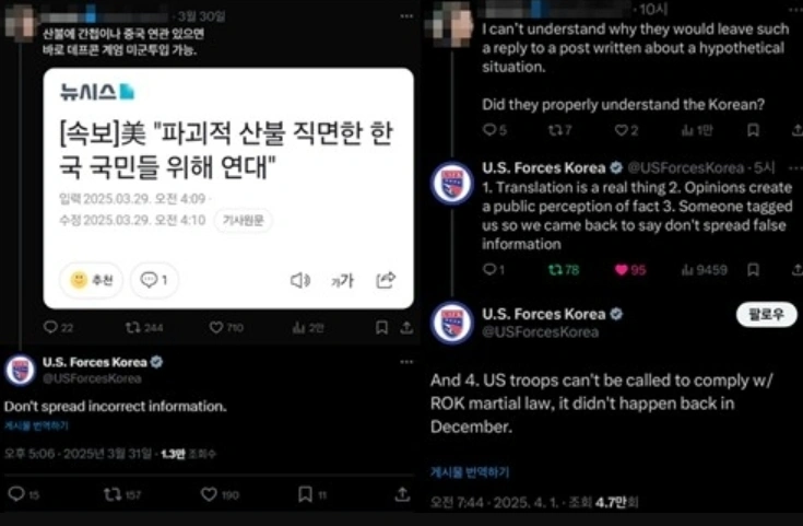 【文/观察者网 刘程辉】3月下旬,韩国东南部丛林大火夺走了数十条生命。然而有韩国网民拐弯抹角试图将祸水引向中国,还招致驻韩美军告急辟谣。 韩国《逐日经济消息》网站4月1日留意到,一位韩国网民此前在外交媒体X平台上发表言论称,“如果山火与中国特工或与中国有关,驻韩美军可以立刻到场戒严”。对此言论,驻韩美军账号有数用英文回复道:“不要散播虚假信息”。