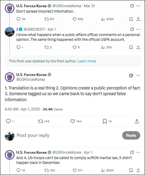 韩国网民在X平台上留言“如果山火与中国有关,美军可以到场” 韩国《逐日经济消息》 在遭到该用户质疑“是否精确明白了韩语”时,驻韩美军账号再次回复夸大:“翻译没标题;观点会塑造公众对毕竟的认知;有人标记了我们,以是我们回复说不要散播虚假信息。” “美军不会服从韩国戒严令,客岁12月也没有发生这种环境。”驻韩美军账号增补道。客岁12月,韩国总统尹锡悦忽然公布天下范围内实行告急戒严令,但仅6个多小时后便公布清除。 《逐日经济消息》称,驻韩美军官方账号对个人用户言论作出云云回应实属有数。 现在,上述涉及中国的帖文已被发布用户自行删除。