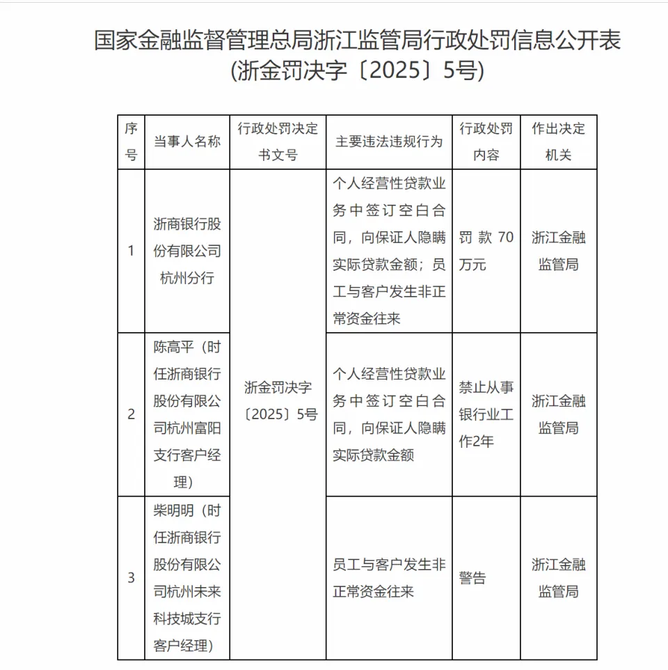 文 晓尧 编辑 刘鹏 刚刚在3月底大手笔向股东派发了42亿元分红的浙商银行(601916.SH),在4月的第一天就因业务违规收到了羁系部门的罚单。 国家金融监视管理总局4月1日披露的行政处罚信息表现,浙商银行股份有限公司杭州分行因个人策划性贷款业务中签署空缺条约,向保证人遮盖实际贷款金额;员工与客户发生非正常资金往来,被罚款70万元。时任浙商银行股份有限公司杭州富阳支行客户司理陈高平,因个人策划性贷款业务中签署空缺条约,向保证人遮盖实际贷款金额,被克制从事银行业工作2年。 据浙商银行官网先容,浙商银行是十二家天下性股份制贸易银行之一,于2004年8月18日正式开业,总部设在浙江杭州,系天下第13家“A+H”上市银行。 查询公开消息可以看到,本年以来,浙商银行已经多次被羁系部门处罚: 1月27日,上海金融羁系局披露的罚单表现,浙商银行因小微企业划型不精确、贷款需求测算不到位、虚增存贷款、违规开立保函、委托贷款委托人不合规等违法违规举动,被责令改正并处罚款1680万元; 同样是在1月27日,国家金融监视管理总局重庆羁系局行政处罚信息公开表表现,浙商银行股份有限公司重庆分行因变相“存贷挂钩”增长企业融资成本,贷款“三查”不到位,绩效稽核不符合羁系要求、设置不合理存款稽核要求,未将贴现业务纳入同一授信管理,员工举动管理不到位,被罚款共计170万元。 3月17日,天津滨海金融羁系部门行政处罚信息表现,浙商银行滨海新区分行因存在“贷后管理不到位”等方面的重要违法违规举动,被国家金融监视管理总局滨海羁系分局罚款30万元。 上述羁系部门给浙商银行开出的四张罚单,金额已经近2000万元,而在2024年整年,浙商银行及分支机构收到金融羁系部门21张罚单,罚款金额合计1364余万元。 浙商银行在策划中频繁被羁系敲打处罚的合规管理题目,已经成了“屡罚屡犯”的难题。在市场人士看来,其内控管理机制存在的缺陷,显然会影响到浙商银行业绩的稳固性。 从浙商银行3月28日发布的2024年度业绩陈诉看,2024年,浙商银行实现业务收入676.5亿元,同比增长6.19%;实现归母净利润151.86亿元,同比增长0.92%,增速明显放缓,在此前的2022年、2023年,浙商银行归母净利润增速分别为7.67%、10.50%;总资产规模也从2022年、2023年的14.66%、19.91%双位数增长,大幅下滑到2024年5.78%的单位数增长。 只管在《2024年度利润分配方案》中,浙商银行阔气宣布向A股、H股股东每10股派息金额1.56元,现金分红共42.84亿元(含税),分红占归属于本行普通股东净利润比例达30.12%,但浙商银行的重要股东横店团体、山东国信,在本年以来相继减持。 1月21日,浙商银行公告称,横店团体基于自身策划发展必要,拟在公告披露之日起15个生意业务日后的三个月内,通过会合竞价和大宗生意业务方式合计减持其持有的A股股票不凌驾约2.746亿股(含本数),即减持比例不凌驾浙商银行总股本的1%。 3月26日,浙商银行发布公告称,股东山东省国际信托股份有限公司通过大宗生意业务累计减持该行1.95亿股,占总股本的0.71%。此次减持后,山东国信持股比例降至2.09%。 |