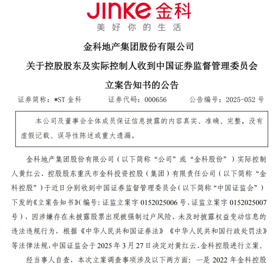 又一位地产大亨“翻车”了。 克日,重庆着名地产大佬,金科股份实控人黄红云遭到证监会存案观察。他2007年就登上了富豪榜,2020年身家一度凌驾200亿元。 这一消息公布后,瞬间成为市场关注的焦点。由于金科股份当下正处于重整的告急关头,实控人与控股股东的这一突发状态,让外界对该公司将来走向充满担忧。 “本次存案对金科股份如今的重整操持不会有太大影响,假如重整操持通过,金科股份实控人便不再是黄红云,因此对上市公司金科股份不会有太大影响。”知恋人士告诉记者。 黄红云被证监会存案观察 身家曾超200亿元 4月3日晚间,金科股份(即*ST金科:SZ000656)公告称,公司现实控制人黄红云、控股股东重庆市金科投资控股(团体)有限责任公司(以下简称金科控股)于克日分别收到中国证监会下发的《存案告知书》,因涉嫌存在未披露股票出现被逼迫过户风险、未实时披露权益变动信息的违法违规举动,中国证监会于2025年3月27日决定对黄红云、金科控股举行存案。 经当事人自查,本次存案观察事项涉及以下两方面: 一是2022年金科控股及黄红云因办理券商质押式回购业务,因无力回购亦不能提供资金举行补仓,使得相关券商对质押股票举行逼迫平仓,导致所持有的金科股份股票被动减持,未能预先披露减持操持; 二是黄红云及金科控股在2022年与原一致举措人清除一致举措关系及减持公司股份造成权益变动情况后,黄红云及金科控股作为信息披露使命人未实时推行权益变动陈诉书的披露使命。 金科股份在公告中体现,黄红云及金科控股对上述事项深表歉意,现已深刻汲取教导并学习了解相关规定,且深圳证券买卖业务所针对上述事项已给予转达批评及接纳相关羁系步伐。 同时,金科股份夸大,上市公司不是涉事主体,不会对公司生产经营运动产生重大倒霉影响,公司将继续稳步推进重整工作,不会对已经表决通过的《金科股份重整操持(草案)》产生倒霉影响,亦不会对提交债权人会议表决的《重庆金科重整操持(草案)》产生倒霉影响。 公开资料体现,黄红云,男,汉族,重庆涪陵人,金科地产团体股份有限公司首创人,现任金科控股董事局主席。 泉源:金科控股官网 黄红云2007年就登上了《胡润百富榜》,2020年,黄红云更是依附215亿元身家在《胡润百富榜》上排名第241。然而天有不测风云,今后的一年间,黄红云财富缩水了七成,2021年身家仅剩60亿元,2022年更是掉出了榜单。 官网资料体现,重庆市金科投资控股(团体)有限责任公司(简称金科控股)是一家涉及地产开发、物业服务和金融投资等领域的大型控股团体,是上市公司金科地产团体股份有限公司(股票代码:000656)一级母公司。团体总资产近4000亿元,一连多年荣膺中国企业500强,中国民营企业500强,位列重庆企业100强第3。 旗下公司正在重整 客岁巨亏超200亿元 4月3日,金科地产团体股份有限公司披露了公司重整事项的最新希望。 公告体现,金科股份及其全资子公司重庆金科于2024年4月22日收到法院受理重整申请的裁定书,公司重整程序正式启动。 根据金科股份及重庆金科第二次债权人会议表决制止时间的投票效果,《金科股份重整操持(草案)》已获第二次债权人会议表决通过,《重庆金科重整操持(草案)》已获第二次债权人会议有财产包管组、职工债权组、税款债权组表决通过,平凡债权组暂未通过。 重庆金科将与平凡债权组协商,并由平凡债权组再次表决。加入对《重庆金科重整操持(草案)》再次表决的债权人为平凡债权组中投反对票大概未投票的债权人,平凡债权组已投同意票的债权人、其他已表决通过的债权组无需再次表决,再次表决事项制止时间为2025年5月10日18时止。 金科股份体现,如今,公司重整相关工作正稳步开展,公司正全力以赴推动相关债权人加入重庆金科第二次债权人会议的再次表决工作及推进重整投资协议推行等工作。 不过,只管金科股份夸大,对于实控人和控股股东被存案观察一事,上市公司不是涉事主体,不会对公司生产经营运动产生重大倒霉影响,公司将继续稳步推进重整工作。然而,有分析人士认为,只管证监会存案对象并非上市公司自己,但实控人的合规题目,仍大概对公司管理和市场信心造成打击。 自2022年来,金科股份陷入比年巨亏。近3年,该公司巨亏超500亿元,此中2022年巨亏213.92亿元,2023年亏87.32亿元。制止2024年9月末,公司资产合计约2000亿元,总负债凌驾1860亿元。 1月24日,金科股份发布2024年业绩预告,该公司2024年预计亏损205亿元~285亿元。 金科股份称,陈诉期内,归属于上市公司股东的净利润亏损的紧张缘故原由如下: 一是受各类因素影响,公司整体项目贩卖下滑,本期到达交付条件的项目较上年同期大幅镌汰,导致本年结转利润镌汰; 二是公司存量房地产开发项目竣工的同时,部门项目因融资逾期未归还,导致符合利钱资本化的项目及对应的金额镌汰,对应有息负债利钱费用化金额增加; 三是陈诉期内公司部门房地产项目存在减值迹象,公司按照企业管帐准则对存货减值举行开端测试,计提资产减值损失; 四是受公司运动性风险一连影响,公司继续计提相应违约金等损失。 制止4月3日收盘,金科股份股价报收1.35元,年内跌超20%,总市值仅剩72.09亿元。 (声明:文章内容和数据仅供参考,不构成投资建议。投资者据此操纵,风险自担。) 编辑|||段炼 易启江 校对|赵庆 封面图片:视觉中国(图