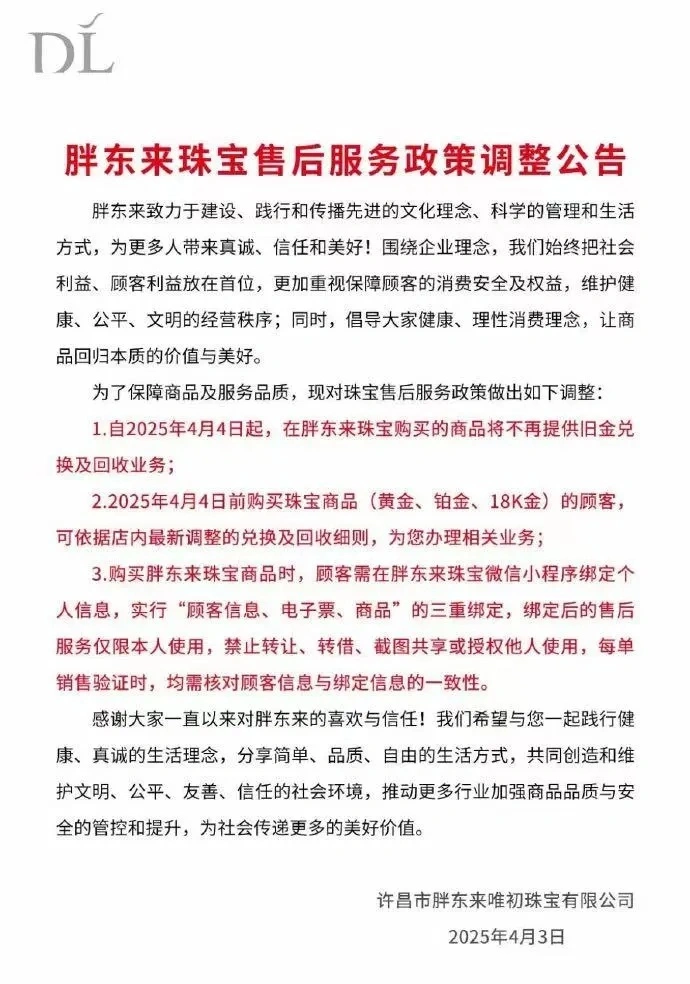 4月3日晚,胖东来专营店发表胖东来珠宝售后服务政策调解公告:胖东来调解旧金兑换及接纳业务。
