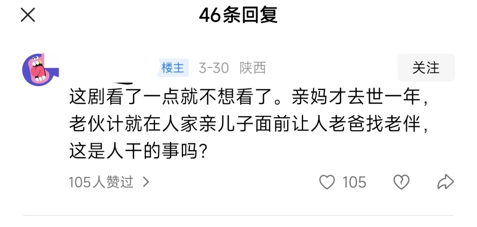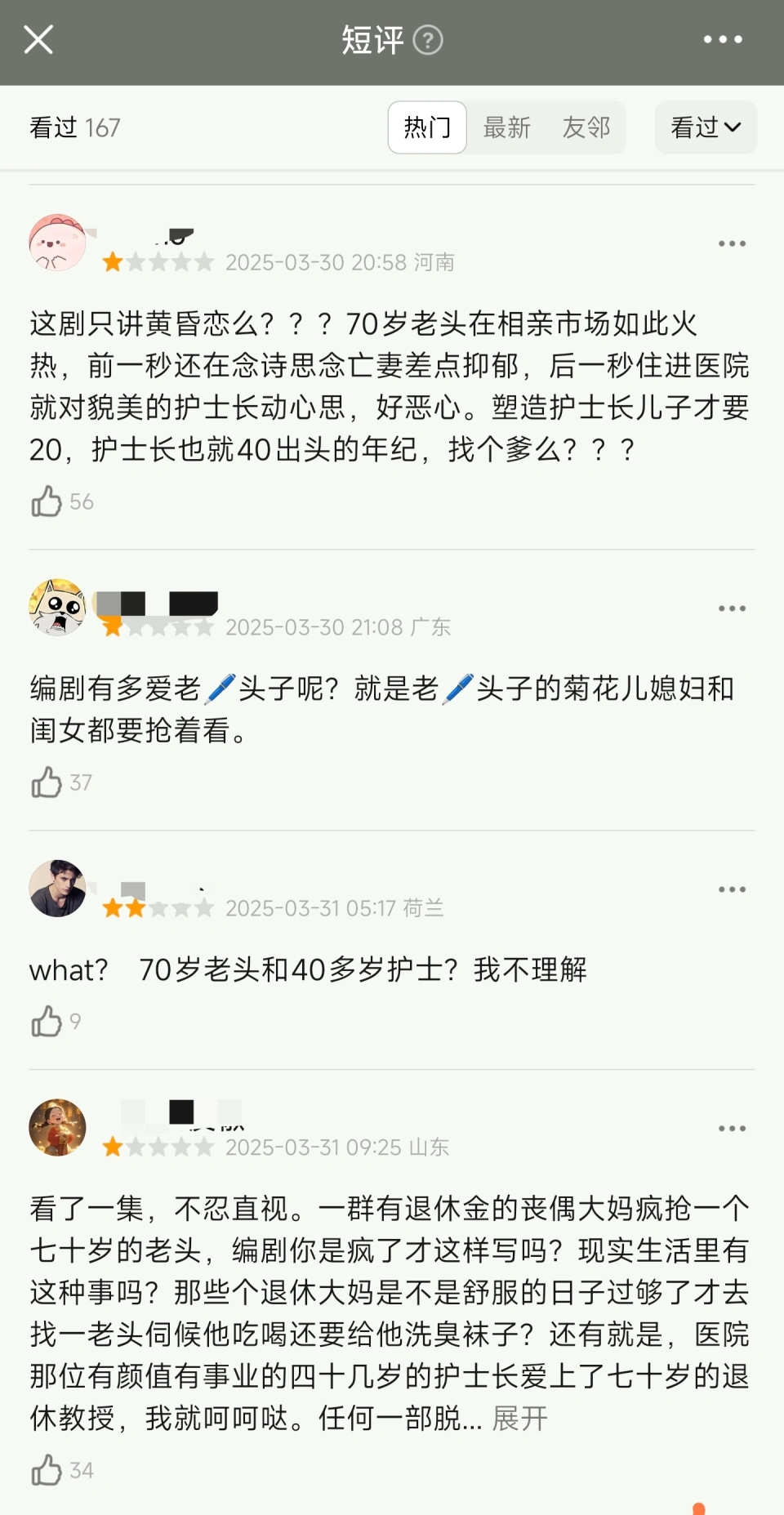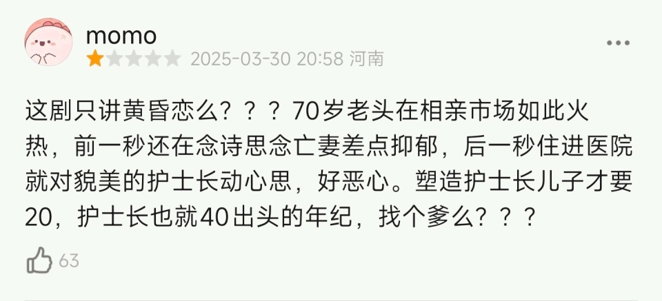 我非常猜疑如今国产剧编剧的精神状态有标题。 比如一群50+演员团体装嫩的《六姐妹》,脸皮都耷拉了还要放肆芳华。 再有闹得沸沸扬扬的《漂白》,把实际中罪犯的名字置换到受害者身上,不知道脑筋里在想什么。 本以为到了四月终于可以消停一会儿了,没成想,又来了一个大的。 前几天,张国立新上线了一部剧。 作为70岁的老戏骨,张国立绝对算是国产电视剧的一块门面,多少人看到他主演的新剧,想也没想立马点开观看。 没成想连看几集后,都懵了—— 这都是啥玩意儿? 故意气我呢是吧? 随着剧集播出后不久,口碑立马全面崩塌,有网友甚至看完后气不打一处来,连差评都懒得给,直接在网上开始咒骂。 一部电视剧而已,为啥能让网友生这么大气? 连看四集,我毫不夷由也到场了差评队伍,这剧看得我一头雾水,不知道编剧要干啥。 ——《我的后半生》 先别误会,这可跟2017年那部《我的前半生》没有半毛钱关系,只是名字蹭热度而已。 该剧由张国立、梅婷、佟大为、韩童生、周野芒、张丰毅主演。 剧中梅婷和佟大为是夫妻,感觉他们俩站在一起,像是进行什么突破伦理的摸索。 但这也不紧张,之以是让网友气愤的主要原因,是作为主角的张国立。 他不但在剧中谈了好几场轰轰烈烈的薄暮恋,甚至还被几十位大妈哄抢追捧,简直可以说是男神中的男神,相亲市场的头把交椅。 我猛烈猜疑,张国立老师演这部剧是不是只是想过把瘾。 剧集开场就是葬礼。 说,张国立扮演的退休传授“沈卓然”老婆罹患癌症,不幸去世。 老伴的离去令沈卓然肝肠寸断,葬礼上亲家母又闹出笑话,手机铃声响起了《本日是个好日子》,直接把沈卓然气到当场晕厥住院。 转眼来到了一年后,沈卓然依然没有走出丧妻之痛。 他整日拿着亡妻给他的保温水杯睹物思人,茶不思饭不想,甚至动不动还要说陪老婆去死。 家里谁来了他也不搭理,跟花语言的次数比人还要多,缅怀最浓郁的时间还会看着亡妻的照片语言,老婆走后的每一天都度日如年。 儿子怕他精神状态出标题,还约请他到场学校活动。 结果他刚刚朗诵了一首《水调歌头》,立马就要朗诵本身写的诗《墓碑》来吊唁亡妻。 惹得学校上下紧急反应,让歌舞团直接上台,这才让灰心的沈卓然鸣金收兵。 第一集从开场到第35分钟,险些都在描绘沈卓然有多蜜意,有多埋头,离开老婆后的他有多缅怀。 连弹幕都不由得夸一句“这老头太蜜意了”。 有的人看哭了,有的人想起了本身的身边事。 可结果呢? 整整营造了半个多小时的深恋人设,随着朗诵被突然停止,沈卓然又被气到住院后。 画 风 突 变 ! 这边,儿媳妇梅婷和亲家母还张罗着给公公找个老伴,那边,躺在病床上的沈卓然直接摸上女护士长的小手了。 一仰面,护士长那叫一个温婉可人,直接把沈卓然看羞了,当场决定—— 俺要追她! 好家伙,上一秒还因为吊唁亡妻被气到住院,下一秒立马满面桃花,把亡妻彻底忘了,对护士长展开猛烈寻求。 最厉害的是,这护士长可比他小了二十多岁啊。 弹幕: 不是?你不刚刚还念诗吊唁亡妻的吗? 跟我装呢? 重生之女护士爱上70岁拉裤兜的我确定目标之后,沈卓然的动作那叫一个猛烈直接。 时不时就要按铃点名要护士长照顾创造时机,刚晤面没反复就要念诗给护士长听,把护士长感动的不要不要的。 甚至还会妒忌。 当别的病房也点名要护士长的时间,他会在心田暗暗较量。 给我干哪来了,这是薄暮恋偶像剧? 结果到了第二集第六分钟,从进度条上来看,两个人晤面后的戏份满打满算也10分钟的时间。 沈卓然就开始偷偷给护士长写情书了。 厉害,厉害,开头用35分钟描绘主角的蜜意,结果另一个女人刚出现就一见钟情,10分钟就开始写情书了? 这节奏,是故意要把观众气死吗? 护士长不在的时间想她念她,来了以后秋波暗送,明眸流转,那叫一个爱在心口难开。 郎有情妾故意,护士长也对他芳心暗许,就差捅破窗户纸了。 甚至尚有一场戏,张国立和女护士两个人卿卿我我,正好被扮演儿媳妇的梅婷撞见.... 我尴尬癌都要犯了。 而且做完手术后,沈卓然有一段时间不能排便,儿子帮他打入开塞露后,一个翻身竟然在床上拉了一裤兜。 结果照旧女护士过来帮他清理干净的.... 邪典!太邪典了! 导演你们这是有什么特殊癖好吗!? 70岁的丧偶老头与小二十多岁的护士长一见钟情。 你以为这就完了吗?远远不止! 就在张国立老师在医院和女护士谈爱情的时间,那边儿媳妇和亲家母又把他的信息公布到了公园相亲角,这一发可了不得,就似乎那唐僧进了女儿国,老太太们听到沈卓然来了,眼神里都冒绿光。 那边一窝蜂围过来像是抢免费鸡蛋,镜头一转,直接举行晤面会了—— 扫码预约,过号不候! 嚯!70岁老头这边把女护士迷的神魂颠倒,写情书谈爱情,那边惊动了整个相亲市场,让大妈团体陷落自动投怀送抱。 我非常猜疑这部剧是张国立老师投资的,只为证实一件事: 我70岁了照样很抢手! 几百号人列队预约相亲的同时,沈卓然也和女护士有结果了。 只见他在老友的助攻下,在稠人广众下念诗表明,后方尚有现场BGM配乐,一套诗念完,护士长害羞接过了诗,答应了老头的告白。 就成了! 我以为我看的是家庭剧,闹半天是70岁的偶像剧?! 而更离谱的是,两个人刚确认关系就爱的水乳融会难舍难分,女护士还没怎么着就搬进沈卓然家里住了,同居了! 然后就出现了让我工伤的一幕: 张国立和女护士躺