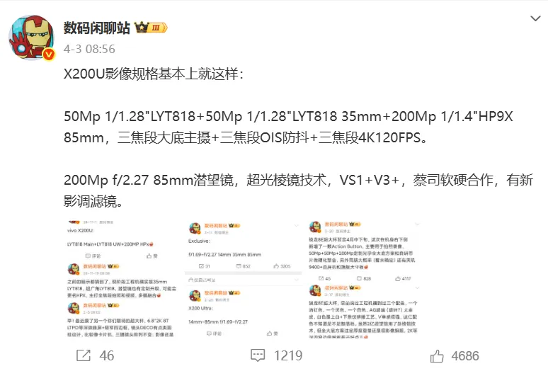 只管尚未公布详细的发布时间,但近期 vivo 产物司理韩伯啸已经开启了预热模式,为 vivo X200 Ultra,X200s 两款新机造势预热。克日,数码博主数码闲聊站也在与网友互动中曝光了 vivo X200 Ultra 的影像规格。 差别于现在主流影像旗舰仍然生存部分 “副摄” 规格镜头的方案。vivo X200 Ultra 接纳了真正意义上的全焦段大底主摄方案,详细为 2 颗 5000 万像素 1/1.28 英寸大底主摄 LYT818 摄像头,分别为原生 14mm 超广角,以及 35mm 经典人文摄像焦段,同时搭载 2 亿像素 1/1.4 英寸 HP9X 85mm 潜望式长焦构成后置三摄方案。据悉该全焦段大底主摄方案还将支持三焦段 OIS 防抖 + 三焦段 4K120FPS 的超豪华规格。除此之外还将接纳超光棱镜技能,VS1+V3+ 两枚自研影像芯片加持,很有大概再度进步安卓影像旗舰的高端。 参考以往爆料,vivo X200 Ultra 还将搭载高通骁龙 8 至尊版处理器,正面为一块 6.82 英寸 2K 分辨率、120Hz 刷新率 LTPO BOE 等深四曲屏,前置 5000 万像素单摄像头。电池容量为 6000mAh 级别,支持 90W 有线,50W 或更高规格无线充电功能。单点超声波指纹辨认、IP68/69 级别防尘防水,北斗三号短报文卫星通讯功能等也将一并搭载。 vivo X200 Ultra 的详细外貌计划,详细发布时间等仍有待官方公布。 |