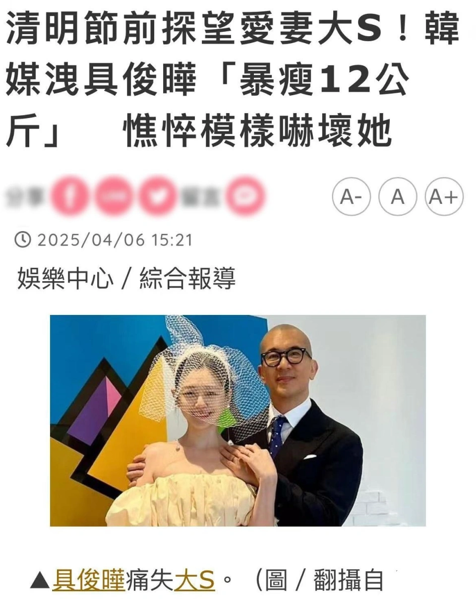 大S徐熙媛的离世令人痛心,转眼间间隔她脱离各人已经已往了2个多月,明朗节的到来也让人再次想起了她,一些粉丝以致前去她的墓地悼念。 此中大S徐熙媛的亲人们依然被各人关注着,4月6日,大S的丈夫具俊晔现状曝光,网友们得知之后都感慨他是个好男子。 具俊晔现状曝光,因缅怀大S暴瘦24斤 根据之前网络上的消息,具俊晔曾在明朗节之前就前去金宝山看望亡妻,如今就只待大S徐熙媛的吊唁雕像建完就能回韩国了。 这段时间,虽然有友人的照顾,但具俊晔还是沉醉在失去大S徐熙媛的伤心当中,以致于很少出门,连饭都没有好好吃。 据韩国媒体爆料,具俊晔的现状不是很好,由于过度缅怀大S徐熙媛让他吃不下饭,结果暴瘦了足足有24斤之多。 还记得之前大S徐熙媛下葬的时候,实在各人从当时曝光的照片就可以看出具俊晔比起之前瘦了不少,只是各人没想到瘦到这么多罢了! 而韩国媒体的爆料很快就被大S徐熙媛的好朋侪证明了,贾永婕之前到场运动接受采访的时候曾透露过具俊晔的情况。 她直言具俊晔非常伤心,也瘦了很多。以致于贾永婕在见到具俊晔的时候都被吓到了,但却也没办法,终极只可以大概嘱咐具俊晔好好照顾本身。 不光仅是具俊晔,实在S妈黄春梅和小S徐熙娣的状态也不是很好,S妈黄春梅疑似精力出现题目,经常通过交际账号发布缅怀女儿的文案。 而小S徐熙娣也也很难过,以致于朋侪邀约她都不乐意出门,倒是前阵子有消息传她们拍卖大S徐熙媛的遗物让他们很愤怒。 汪小菲一家过得很舒心,小玥儿姐弟已经规复过来 小S徐熙娣直接痛斥了那些流传谎话的无良媒体,以致体现大S徐熙媛的离世对于她来说是天崩地裂的,又怎么会去拍卖大S徐熙媛留下来的珠宝呢? 而对比起大S徐熙媛的家人们,汪小菲家的情况明显好很多,过得很舒心,至少两个孩子都走出了失去妈妈的阴影。 此前汪小菲曾带着小玥儿姐弟去香港旅游散心,他们享受着香港陌头的美食,而前几日汪小菲还带着儿子去逛公园,父子俩相处很温馨。 而在4月5日,张兰前去马来西亚度假的时候显得很开心,她还感慨本身10年前和儿子带着小玥儿等家人一起包机去度假的韶光。 从她脸上的笑脸来看,确实很开心,也很享受,只能说人的悲欢并不相通,不外网友们也可以理解,比起天都塌了的大S徐熙媛一家,汪小菲家可谓是春风得意。 拿到两个孩子抚养权且不说,汪小菲和马筱梅两人还筹划着过阵子要举行婚礼。 这个消息此前颠末了台湾着名节目主持人吴宗宪的证明,吴宗宪体现汪小菲已经给他送请帖了,不外他并不计划到场。 大概是碍于大S徐熙媛离世不久,由于他们的交情选择不到场,又大概是由于工作太忙,终极吴宗宪婉拒了,从这可以看出大S因缘还是很好的。 就是不知道小伙伴们对于具俊晔被曝由于缅怀大S瘦了24斤这件事怎么看呢? |