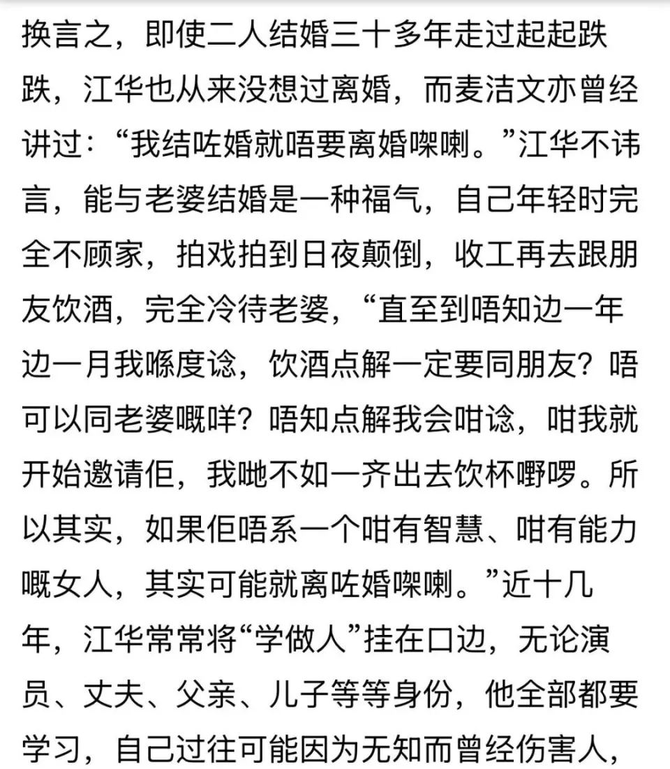 4月6日,据港媒曝光江华最新采访内容,他回应被骂“渣男”一事,坦言哪个少年不轻狂呢?但他有自己的底线,就是不可以仳离。 据悉,江华接受采访当天,太太麦洁文也在场,他反复表忠心,赞赏太太是一个有聪明的人,如果只是普平常通的女人早就仳离了,他是真的爱麦洁文,只不外以前放在内心,不懂得用举措表现,到了40岁才学会“做人”,还说如果有下辈子,仍旧要和老婆在一起。 江华还在采访中表现,实在自己有很多时机和别的女人在一起,但他没有那么做,你可以骂渣男,但他的底线就是不仳离,他并不接受“如果爱我就要接受我的一切,包罗不止一个女人”的说法,直言这个捏词太离谱,叮嘱女性别在男偶像面前说爱你,由于男子是无法容忍自己老婆爱上别的一个男子的,这就是人性。 两人完婚30年风雨同舟,江华先后履历抱病、赋闲卖保险等妨害,太太不离不弃伴随,成为他的精力支柱,坦言从来没想过仳离,自己过往大概由于无知而曾经伤害人,自己不是一个好人,如今要学习做一个好人。 江华(Kwong Wa),原名陈木华,汉族,1962年11月19日出生于中国香港,中国香港男演员、歌手。 1991年,江华与歌手兼演员麦洁文因摄音乐特辑相恋;1992年12月,江华与麦洁文完婚,并育有一子一女。 报料、维权通道:应用市场下载“晨视频”客户端,搜索“报料”一键直达;或微信添加报料客服:xxcbcsp;或拨打热线0731-85571188。如需内容互助,请拨打政企服务专席19176699651。 |