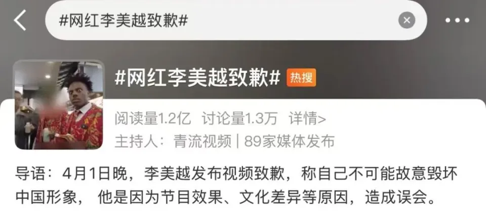 克日,网红李美越被打码,登上微博热搜。 据北京青年报消息,4月5日,央视消息《消息周刊》栏目播出“本周人物 甲亢哥:奇幻中国行”,有仔细的网友发现,网红李美越被打码。 此前,李美越给“甲亢哥”当随身翻译时,被网友指责其曲解原意、用词不当。 在直播期间,“甲亢哥”去理发店,理发师说脏辫布局复杂,解开就没法规复原样,李美越却跟“甲亢哥”说理发师嫌头发脏,不给做头发。他还在车上用贬低性的词语称要介绍中国女孩给“甲亢哥”,用英语对“甲亢哥”吐槽粉丝太吓人了,“不像正凡人”。 过后,有不少博主和网友发视频,喊话李美越出来致歉。 4月1日晚,李美越发布视频致歉,称本身不大概故意粉碎中国形象,他是因为节目效果、文化差异等缘故原由,造成误会。他还提到在理发店时的表现不佳,给理发师和店肆带来了尴尬。 李美越表现:“部分博主曲解了我的原意,我不绝做的是中国文化出国内容,不大概故意粉碎中国形象;根据‘甲亢哥’和其他粉丝不绝以来的互动方式,选择了为难、讥讽的节目效果,过后看确实效果不太好;如果各人以为不惬意我致歉,以后也会思量每句话和运动。” 截至目前,李美越在短视频平台有约736万粉丝,掉粉已超30万。在其品评区,有不少网友对他的致歉并不买账↓ 据九派消息报道,4月7日,理发店工作职员表现,李美越并未向门店私下致歉,但是有看到他的公共致歉视频,门店和店员也都继承他的致歉。其称,因为不懂英文,当时并不知道李美越翻译的内容是什么,但此事对门店产生了负面影响,通过短视频平台来理发的客流量少了30%。 据悉,李美越,系美越混血。2023年年底,“让东北大花征服天下”的话题登上热搜。此中李美越穿着东北大花T恤、戴着墨镜走在国外陌头火出圈,让他被众人熟悉。 (泉源:中国青年报、北京青年报、九派消息) 更多精彩资讯请在应用市场下载“极目消息”客户端,未经授权请勿转载,接待提供消息线索,一经接纳即付报酬。24小时报料热线027-86777777。 |