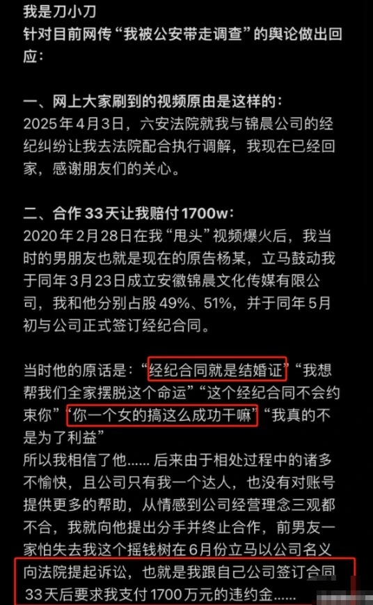 刀小刀回应被抓变乱,被前男友算计,分手后被要求赔偿1700万,克日,拥有千万粉丝的网红“刀小刀”因经济纠纷被警方带走观察,引发广泛关注。据悉,刀小刀曾依附一段甩头舞变装视频在抖音走红,敏捷积累了大量粉丝。 刀小刀在微博发布声明,详细阐明白变乱颠末,她表现,2020年走红后,与前男友杨某共同建立了一家MCN机构,她持股49%,杨某持股51%,然而,由于两人相处不愉快,公司也未能对她的账号运营提供实质性帮助,终极导致分手并提出解约,随后,杨某以公司名义告状刀小刀,要求赔偿1700万元人民币的违约金,颠末诉讼,法院判决她需赔偿442万元人民币。 刀小刀夸大,她并未躲避债务题目,一直积极与对方沟通,提出以房产抵押的方式归还欠款,但对方对峙要求一次性全额付出现金,因此,出现了被警方带走观察的环境,她表现愿意为自己的灵活买单,但也不希望对方得逞,已申请再审,希望法院给予公正裁决。 网友们对刀小刀的声明反应不一,一些人对她表现怜悯,以为她在感情和古迹上都遭遇了不公报酬,但也有人质疑其说法的真实性,以为两边各执一词,难以判定原形。 比年来,网红与经纪公司之间的纠纷屡见不鲜,许多主播在签约MCN机构后,因长处分配、条约条款等题目产生抵牾,以致引发法律诉讼,比方,网红林晚晚、沈龙等人也曾因与公司解约题目而备受关注。 专家建议,网红在签约经纪公司时,应仔细审阅条约条款,明白两边的权利和义务,制止日后产生纠纷,同时,两边应本着诚信原则,公平公道地办理相助过程中出现的题目,共同维护精良的相助关系。 对于刀小刀变乱,公众应理性对待,等候司法构造的公正裁决,同时,这也为其他网红和经纪公司敲响警钟,提示他们在相助过程中应更加审慎,制止类似变乱的发生,对此你们有什么想吐槽的吗? |