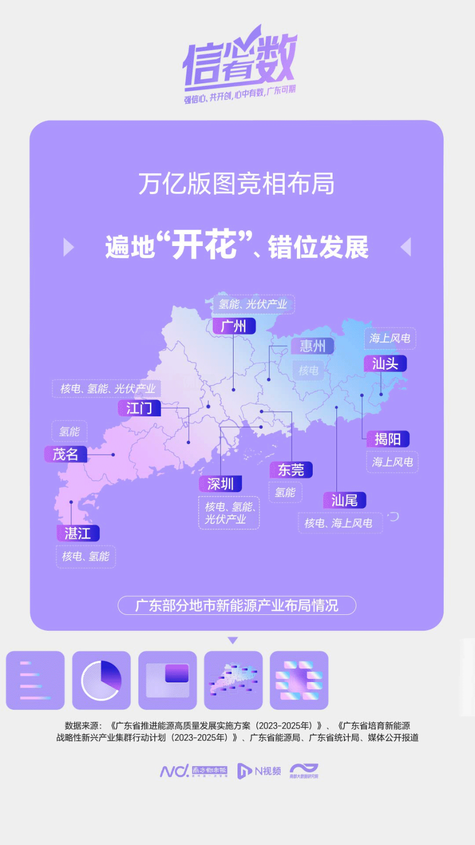 从新能源财产版图结构来看,广东不绝走在天下火线,各地竞相结构、错位发展,提升含“新”量。先有大亚湾核能,再有阳江风电,现在广深佛的氢能财产也在快速崛起中。 在核能方面,广东是天下最早创建发展核电的省份之一。1994年,大亚湾核电站正式投入商用,广东核能财产进入起步阶段。颠末30多年的发展,当前,广东已建成大亚湾、岭澳、阳江、台山等多个核电站,平静岭、陆丰、廉江等核电项目也在有序推进创建中。 海上风电财产也连续强大。最新数据表现,目前阳江已建成国内风电装备制造财产集群之一,海上风电建成装机容量居天下火线。除阳江外,海上风电财产在汕头、揭阳、汕尾等粤东地区也发展得风起云涌。在汕尾,粤东首个超百万千瓦级海上风电场每年可提供干净电能超45亿千瓦时,等效减少标媒斲丧约135万吨,减少二氧化碳排放约350万吨。 在氢能方面,广东是国内氢能财产发展最早、财产覆盖最全、应用范围最广泛的地区之一。2023年,广东印发《广东省加速氢能财产创新发展意见》。2024年6月,广东省广湛氢能高速树模项目正式推出。地市发展层面,广东已渐渐形成以广深佛三市为龙头的氢能财产格局。广州在氢能财产的上中卑鄙全链条均有结构,此中,燃料电池体系核心零部件根本实现当地化生产,在国内处于领先职位。深圳正加速推进加氢站结构创建,并于客岁颁发了首张加氢站气瓶充装允许证。佛山则是国内较早结构发展氢能财产的都会,南海区更是被称为“中国氢能财产之都”,全市共有氢能企业和机构170多家。