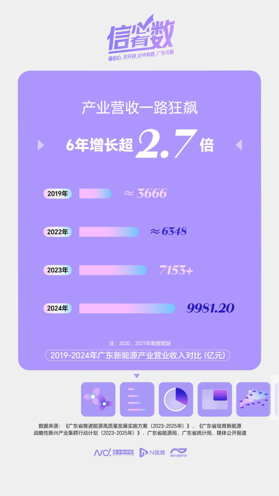 比年来,在政策的推动和引领下,广东新能源财产发展驶入快车道,业务收入6年增长了超2.7倍。 广东新能源财产起步早,早在2019年就形成了较好的财产规模。数据表现,2019年,广东新能源财产业务收入已突破4000亿元。2022年、2023年全省新能源财产业务收入分别突破了7000亿元、8000亿元,2024年达11163.18亿元,提前一年实现目标。新能源财产也成为广东第九个万亿级的财产集群。至此,广东已形成包罗新一代电子信息、当代轻工纺织、先进材料、绿色石化、当代农业与食品、智能家电、软件与信息服务业、汽车、新能源在内的9个万亿级财产集群。