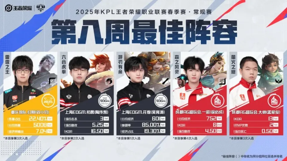 2025KPL春季赛 通例赛第三轮热血激战 2025KPL春季赛通例赛 第八周最佳阵容公布 快来和K妹一起看看吧~ 2025KPL春季赛 第八周最佳阵容&最佳选手 2025KPL春季赛通例赛第八周最佳阵容&最佳选手希奇出炉,快来和K妹一起看看吧~ 最佳对抗路 重庆狼队.归期(双小钧) 本赛季第3次入选 标签:雷霆之王 本周归期(双小钧)MVP次数1,分均伤害5008,伤害占比22.4%,均排名S组对抗路第一。 司空震怒傲乾坤,雷电轰鸣战血存 与杭州LGD.NBW的对决中,使用司空震,开局十二分半,野区攻防战,在己方焦点C位百里守约率先被击杀的倒霉局面下,果断大招“排山倒海”岑寂反打,一技能“奔雷疾”疾行追击,二技能“狂雷击”越塔跟进,强势击杀敌方上射两路,拿下二连击破。 最佳打野 上海EDGM.初晨(陶传凯) 本赛季第2次入选 标签:六合虎拳 双形变更风云动,虎魄雄心震九川 与北京WB的对决中,使用裴擒虎,开局十四分钟,暗影暴君争取团战,“虎啸风生”切换虎形态,二连扑击击杀敌方下路双人组,人形态“冲拳式”补足伤害,连续追击,再斩敌方打野镜,豪取五连绝世。 最佳中路 上海EDGM.花卷(吴育涛) 本赛季第1次入选 标签:游刃有余 本周花卷(吴育涛)MVP次数1,分均经济601,经济占比19.3%,均排名S组中路第一。 沈家小仙智自高,梦寻奇术火中烧 与北京WB的对决中,使用沈梦溪,开局五十秒,野区入侵团战,二技能“正常操纵”点燃状态疯狂投弹,一技能“猫咪炸弹”补足伤害,乐成击杀敌方打野大司命,拿下第一滴血,为队伍打开前期节奏。 最佳发育路 成都AG超玩会.一诺(徐必成) 本赛季第4次入选 标签:森之风灵 本周一诺(徐必成)分均经济752,场均助攻4.50,KDA6,均排名S组发育路前列。 虞女挽弓如月悬,英气长存矢自利 与佛山DRG的对决中,使用虞姬,开局十六分钟,高地攻防战,侧翼找准输出位,大招“阵前舞”减速敌方关羽,精准普攻再斩敌方发育路公孙离,拿下二连击破,顺势推掉敌方水晶,资助队伍拿下春季赛七连胜。 最佳游走 成都AG超玩会.大帅(孟家俊) 本赛季第3次入选 标签:萤火之旅 本周大帅(孟家俊)MVP次数2,KDA13,每死承伤143758,均排名S组游走位第一。 桑林翠影护苍原,启梦灵心佑友安 与佛山DRG的对决中,使用桑启,开局十一分钟,暗影主宰争取团战,一技能“桑木为引”精准击飞敌方发育路公孙离,共同虞姬,拿下公孙离人头。顺势收下暗影暴君并乐成推掉敌方上路高地塔,资助队伍逆转战局。 最佳选手 上海EDGM.初晨(陶传凯) 本赛季第1次入选 传奇操纵心先定,凯旋时候梦方酬 本周初晨(陶传凯)在“野核”与“坦野”间自由切换,野区入侵时机美满,团战操纵本领极限。对阵北京WB的比赛中,更是依附成名好汉“裴擒虎”强势拿下“五连绝世”,资助队伍继续稳步进步。 传奇操纵心先定,凯旋时候梦方酬 使用裴擒虎,冲拳式,气守式,操纵极限; 使用元流之子(坦克),汇流为一,以身为引,入侵暴虐; 使用夏侯惇,英气斩,龙卷闪,开团果决; 恭喜上海EDGM.初晨(陶传凯)斩获2025年KPL春季赛通例赛第八周最佳选手! 让我们共同等待他在后续比赛中的出色体现~ 2025KPL春季赛 第八周新锐选手排行榜 2025KPL春季赛每周新锐选手排行榜第八周榜单公布~ TOP1:长沙TES.A 深巅(张嘉俊) 分均伤害:5284(1st) 分均经济:764(1st) TOP2:佛山DRG.花缘(谭锦威) 分均承伤:4963(1st) 经济转承伤:8.02(1st) TOP3:北京WB.听悦(吴佐) 经济转输出:12.48(1st) 分均伤害:6276(3rd) TOP4:上海EDGM.凌云(陈泓铭) 场均助攻:5.75(1st) 场均击杀:1.75(3rd) TOP5:长沙TES.A 小优(秦子恒) 场均助攻:7.33(1st) 场均击杀:2(1st) 更多排名详见长图 每一次排名变化都是少年们交出的热血答卷,新生气力正以锐不可当之势撕破通例!等待这些年轻的面目在未来绽放更耀眼的光芒,创造属于他们的期间! 注:新锐选手入围界说:选手于2025年度首次登场KPL联赛,且本周上场率≥40%; 数据排名均为18支队伍同位置选手排名。 <上下滑动检察更多> |