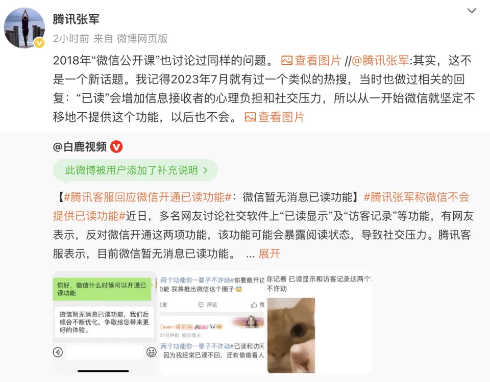 备受关注的“微信已读功能”又上热搜了。 克日,有多名网友讨论外交软件上“已读体现”及“访客纪录”等功能,并引发 “微信何时推出已读功能” 的话题不断发酵,讨论热度居高不下。 支持开通的网友以为,在工作场景中,急需已读功能来确认重要消息是否被对方及时查察,以进步沟通服从。反对者则担心,一旦上线已读功能,会给自己带来不须要的外交压力,在看到消息后不得不立即复兴。 面临网友们的热切关注,4月9日,腾讯客服体现微信暂无消息已读功能。随后,腾讯公关总监张军也在微博上举行了回应。 张军称这并不是一个新话题,2018年“微信公开课”曾讨论过同样的标题,2023年7月也有过雷同的热搜,当时也做过相干的复兴:“已读”会增加信息吸收者的心理负担和外交压力,以是从一开始微信就百折不挠地不提供这个功能,以后也不会。 据界面消息观察,如今国内外不少着名外交平台均具有已读功能,比方抖音和快手的已读重要体如今私信互动中,当对方查察私信后,体系会主动体现已读状态。固然,用户也可以在设置中关闭这一功能。 作为TO B类办公软件,钉钉的已读功能重要基于工作场景,目的在于节省等候复兴的时间资本,进步消息转达服从。像淘宝、闲鱼等电商类外交平台也设有已读功能,可资助商户满足用户即问即答的需求,促进交易业务转化。 海外交际软件中,WhatsApp、Facebook、Telegram、LINE等也都具有已读功能。像在WhatsApp上,当发送的消息被对方阅读后,消息旁边会出现两个蓝色的小勾,表明对方已读。用户同样可在设置中自行选择关闭 “已读” 功能,掩护自己的隐私。 在Telegram中,消息状态分为单勾(消息已乐成发送,但吸收者尚未收到)、双勾(消息已乐成送达给吸收者,但吸收者尚未查察)和双勾变蓝(吸收者已阅读该消息)。该软件支持用户在设置中选择隐蔽自己的已读状态,也可以在某些群组中利用匿名模式来隐蔽已读状态。 若以月活数(MAU)来计,截至2025年2月,全球排名前三的外交平台分别是Facebook、YouTube和WhatsApp,微信及WeChat的归并月活泼账户数为13.85亿,位居第六。 值得一提的是,只管微信对峙不推出已读功能,但其也在不断优化和更新其他实勤奋能。 微信最近即上线了 “语音停息” 功能,用户在发送较长语音时,可随时停息录制,方便增补或修改内容,大大提升了语音输入的便捷性。别的,“图片提取笔墨” 功能也得到了进一步优化,可以或许资助用户快速从图片中提取所需笔墨信息,进步了信息处置惩罚服从。 |