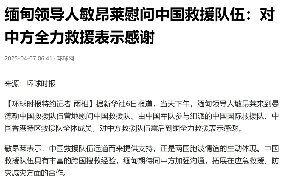在缅甸发生地震后,中国秉着道义,第一时间向缅甸伸出了援手,然而令人意想不到的是,救灾过程中还是发生了一些小插曲,好在缅甸军政府及试?错,让类似事故不再重演。 众所周知,这次缅甸发作强震后,中国接济队是第一支抵达本地的国际接济队伍,而且中国的救灾物资还在源源不停的运往缅甸,尽最鼎力大举气资助这个常年身处战乱的邻国,可谓是仁至义尽。 然而,不测环境还是发生了,缅甸军政府对中国接济车队鸣枪告诫,差点酿成大祸。 据团结早报报道,缅甸军政府发言人佐敏吞日前对外证明,4月1日晚,军政府曾向中国红十字会的车队鸣枪三次发出告诫,当时由9辆车构成的车队出现在缅北掸邦的囊秋镇,而这里是交火区,于是军政府举行了拦截,在间隔中国车队100米外鸣枪,随后对方就折返了。 缅方此举无疑令人担忧,在中国交际部记者会上,发言人夸大,现在接济职员和物资均安全,衷心希望缅甸各族各派同心同德、共克时艰,强烈敦促缅甸各方确保中方在内各国接济职员和物资安全,确保接济运输通道流畅。 而当中方倔强亮相,划下红线后,敏昂莱敏捷回过味来了,立刻改口同意停火,军政府公布克日起至4月22日暂时停火,以举行救灾和重修工作。 不光云云,缅甸官方也公开感谢中国,缅甸仰光省首席部长梭登表现,每当缅甸遇到困难,中缅之间的胞波友谊推动着中国第一时间送来温暖,非常感谢中国的朴拙资助和付出的统统。 别的,据环球时报报道,6日缅甸向导人敏昂莱亲身前去曼德勒中国接济队伍营地慰问,向中方接济队伍表达感谢。 从现在来看,缅甸的心可以放回肚子里,中国不会因此暂停对缅援助,商务部明白表现,将继承调运接济物资,资助缅甸人民早日渡过难关。 真话说,这起事故并非偶然,而是缅甸常年内战配景下的肯定结果,只不外这回遇到的是中国车队,不外好在事情没有闹大,否则悔之晚矣。 而敏昂莱及时认识到题目的严峻性,允许少数民族武装提出的暂时停火提议,从某种程度上来讲,也算是给中国的一个交接,那就是做到确保接济运输通道流畅。 必须分析的是,中方提出的要求,缅甸军政府只做到了一点,更为关键的是,要保障中国车队安全,现在还没有看到敏昂莱做出包管。 因此,缅甸感谢中国只是一方面的,我们正在期待军政府接纳切实举措,掩护在缅中国接济职员安全,如许才是对中国的最好回报。 中国出力资助缅甸救灾,缅方提供掩护本就是应该的任务,而不是寒了各国接济队的心,否则以后谁还敢伸出援手? 固然,思量到眼下缅甸的环境,缅甸各界都应该意识到,比天灾更为可骇的是人祸,尽快竣事内战混乱局面才是长期之计,否则缅甸大众将永无安宁之日,更加谈不上发展。 |