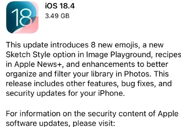 苹果之前已经向iPhone手机推送了iOS18.4正式版升级更新,而且苹果目前已经关闭了iOS18.3.2正式版的验证通道,这也就是说已经升级更新到iOS18.4正式版的iPhone手机不能降级回iOS18.3.2正式版了。 iOS18.4升级为Apple Intelligence带来了多语言支持,增长了优化级关照功能,为iPhone15系列手机带来了视觉智能(Visual Intelligence)功能,为iPhone15,iPhone16系列手机带来5G-A 网络功能等等,iOS18.4体系升级还修复了多个体系题目。 根据国外媒体报道表现,在iOS18.4正式版之后苹果目前正在预备iOS18.4.1正式版升级。 根据国外媒体MacRumors报道表现,苹果目前正在测试iOS18.4.1升级,iOS18.4.1正式版升级应该不会带来什么新功能,主要照旧修复性升级,修复体系错误,提升安全性等等,现在还不知道iOS18.4.1正式版什么时候推送。 而且苹果目前已经推送了iOS18.5测试版升级,iOS18.5正式版预计会在5月的时候推送升级。 |