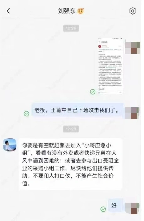 美团高管发言 知乎平台截图 观察者网获悉,关于此事,刘强东也在京东内部的谈天表达了本身的看法,称“不要和人打口仗,不能产生社会代价。” 以下是刘强东回应内容全文: 你要是有空就赶紧去参加“小哥应急小组”,看看有没有外卖或者快递兄弟在大风中碰到困难的!或者去到场出口受阻企业的采购小组工作,尽快给他们提供资助。不要和人打口仗,不能产生社会代价。