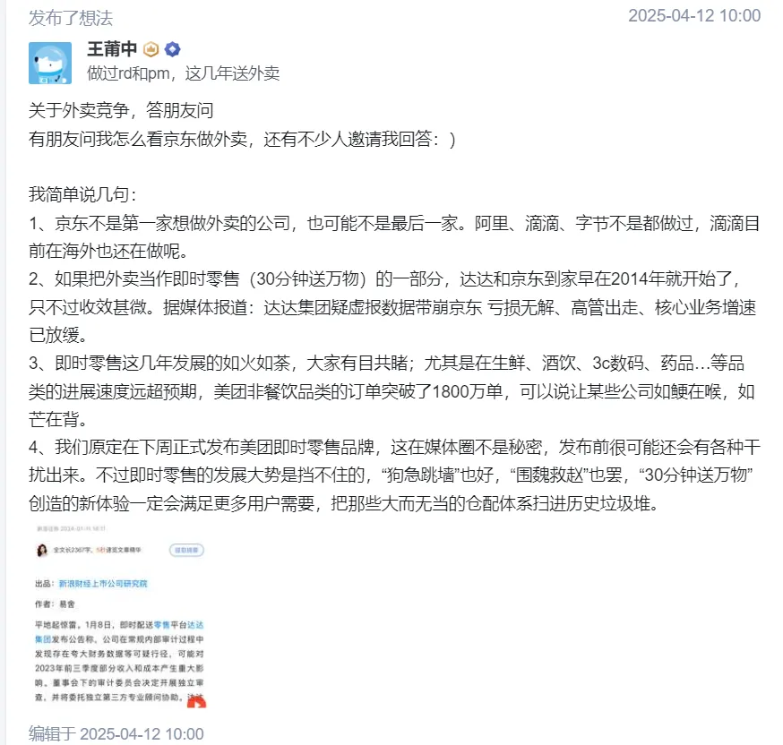 4月12日午间,美团当地商业CEO王莆中通过多个渠道在外交平台发文,表达了本身对于京东外卖的看法。 相干内容全文如下: 1、京东不是第一家想做外卖的公司,也大概不是末了一家。阿里、滴滴、字节不是都做过,滴滴目前在海外也还在做呢。 2、如果把外卖看成即时零售(30分钟送万物)的一部分,达达和京东抵家早在2014年就开始了,只不外收效甚微。据媒体报道:达达团体疑虚报数据带崩京东 亏损无解、高管出走、核心业务增速已放缓。 3、即时零售这几年发展的风起云涌各人有目共睹:尤其是在生鲜、酒饮、3c数码、药品...等品类的希望速率远超预期,美团非餐饮品类的订单突破了1800万单,可以说让某些公司如鲠在喉,如芒在背。 4、我们原定在下周正式发布美团即时零售品牌,这在媒体圈不是机密,发布前很大概还会有各种干扰出来。不外即时零售的发展局势是挡不住的,“狗急跳墙”也好,“围魏救赵”也罢,“30分钟送万物”创造的新体验肯定会满意更多用户需要,把那些大而无当的仓配体系扫进历史垃圾堆。