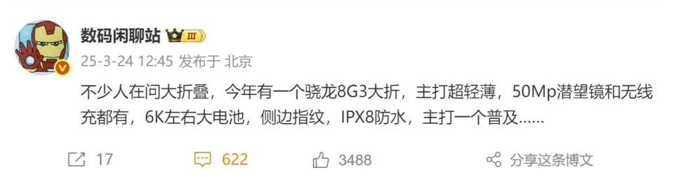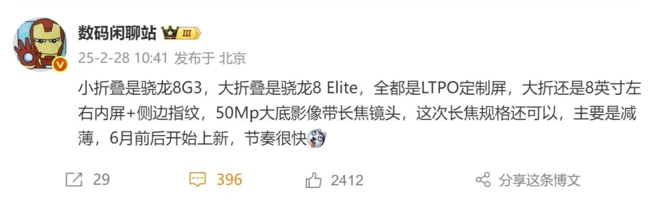 高通、联发科新一代旗舰芯片骁龙8至尊版和天玑9400发布至今已已往数月,在此期间,小米、OPPO、vivo、光彩等厂商相继推出了搭载这两款芯片的全新旗舰机型。 在放弃传统双旗舰战略后,安卓手机厂商广泛用折叠屏手机代替第二款旗舰,然而今年手机厂商的动作却稍显迟缓,迄今为止只有OPPO发布了搭载新一代旗舰芯片的折叠屏手机。 按照惯例,最迟第三季度主流安卓手机厂商就会发布新一代折叠屏手机,距今只有不到半年之间。作为消费者的我们,究竟是该购买已发布的安卓折叠屏手机OPPO Find N5或鸿蒙折叠屏手机华为Mate X6/XT、Pura X等,还是应该等待小米、vivo、光彩、三星的新品呢?跟雷科技一起看看25年最值得等待的折叠屏新机吧。 小米:小折叠扛大梁,大折叠延期如今折叠屏手机主要有两种形态,即大折叠(横折)和小折叠(竖折),三折、阔折等形态虽有产物问世,但推出这种形态产物的厂商不多。 小米旗下的MIX Fold 4和MIX Flip虽资助小米折叠屏手机实现了销量逆袭,2024年第三季度位居国内折叠屏手机销量前三,全年销量位列第四,但主要功臣是「不做漂亮小废物」的MIX Flip,而非MIX Fold 4。 正因如此,网上不停传播着小米放弃大折叠手机的消息。日前有网友在著名数码博主@数码闲聊站微博下询问MIX Fold 5的消息,得到的回复却是「可以蹲一下小折叠」。如此来看,MIX Fold 5未必被放弃,但今年我们大概率看不到了。 (图源:微博截图) 小米小折叠手机MIX Flip 2日前已通过了3C认证,型号为2505APX7BC,搭载骁龙8至尊版,支持67W快充。该博主曝出的数据显示,MIX Flip 2将补上50W无线充电和IPX8,影像方面则是1/1.5英寸大底主摄+5000万像素超广镜头,取消了竖立长焦镜头,电池预计将到达5050mAh,尺寸保持不变。 相较于上一代产物,MIX Flip 2设置险些全面进步,唯一值得商讨的是将2倍长焦更换为超广角是否值得。代价方面,小雷猜测MIX Flip 2会与上一代保持雷同售价。 MIX Flip热销的焦点在于风雅小巧的操持,深得女性消费者喜欢,因而@数码闲聊站还表现MIX Flip 2将新增少女向定制配色。与上一代产物雷同,MIX Flip 2预计会在7月发布。 (图源:雷科技摄制) 依附相对实惠的代价和针对女性消费者的外貌定制,MIX Flip 2有望一连上一代产物的销量趋势,扛起小米折叠屏手机走量的重任。 至于MIX Fold 5,网上也传出了许多消息,如搭载屏下摄像头、影像功能升级等,大概会耽误到来岁发布,给广大米粉一个惊喜。 vivo:小折叠不见影,大折叠正在路上与大概放弃大折叠手机的小米相反,vivo出现了放弃小折叠手机的迹象,上一代小折叠手机vivo X Flip发布于2023年4月,至今已有两年时间,却迟迟未发布迭代产物。直到今天,vivo X Flip 2在网上也没有相关爆料,很大概项目已被取消。 大折叠手机vivo则一连了下来,@数码闲聊站曝出的信息显示,vivo X Fold 4将搭载骁龙8 Gen 3处置处罚器,接纳超浮滑+侧边指纹操持,具备无线充电和6000mAh大电池,补上了潜望长焦,主打「遍及」。 (图源:微博截图) 须要注意的是,vivo上一代大折叠手机vivo X Fold 3系列分为尺度版和Pro版两个版本,与其他厂商只推出一个版本差别。从该博主的爆料来看,vivo大折叠屏手机大概要取消双版本规划,只推出一个版本。 题目是,vivo X Fold 3 Pro便搭载骁龙8 Gen 3和潜望式长焦镜头,与vivo Fold 4的差别大概只有厚度和指纹。新机将指纹解锁模块从3D超声波双屏指纹更换为侧边指纹,消费者是否认但是个题目。 好消息在于,vivo X Fold 4既然主打遍及,代价大概率会比上一代产物自制。参考vivo X Fold 3 Pro首发代价高达9999元,小雷猜测vivo X Fold 4首发代价预计在8599元左右,今年第二季度发布。 (图源:vivo) 大概会有一些消费者不满足该产物搭载骁龙8 Gen 3,而不是骁龙8至尊版,但从利用场景方面思量,除了个别对于性能要求极高的游戏场景,其他场景骁龙8 Gen 3和骁龙8至尊版体验差距不会很大,骁龙8 Gen 3能够有效低落vivo X Fold 4的成本和代价。@数码闲聊站声称,假如用上骁龙8至尊版,vivo X Fold 4的代价将上涨1000元。 而且按照@数码闲聊站的说法,今年国产大折叠手机中,大概只有两款搭载骁龙8至尊版,一款是已经发布的OPPO Find N5,另一款则来自光彩。 光彩:用堆料保卫折叠手机的职位只管光彩手机出现了销量下滑的环境,但在折叠屏手机市场,光彩却是仅次于华为的厂商,2024年市场份额高达20.6%,大幅领先第三名vivo。 (图源:IDC) 2025年光彩巨细折叠屏手机均将迭代更新,此中小折叠机型Magic V Flip 2搭载骁龙8 Gen 3和定制LTPO屏幕,主打超大外屏,其他设置曝出的信息较少。小雷以为,Magic V Flip 2大概率将效仿MIX Flip 2,主要设置和操持与上一代相似,以便于压缩产物成本。 (图源:微博截图) Magic V Flip售价为4999元起,Magic V Flip 2有大概一连该定价。4999元起的代价加上折叠操持,对于性能需求不高的消费者而言,吸引力大概比MIX Flip 2更胜一筹。 Magic V4搭载骁龙8至尊版、8英寸2K 120Hz LTPO内屏、6.45英寸120Hz LTPO外屏、侧边指纹解锁、6000mAh大电池、5000万像素1/1.5英寸大底主摄、2亿像素1/1.4英寸3倍光学变焦大底长焦镜头,支持无线充电、IPX8、卫星通信,机身厚度不到9mm。 (图源:微博截图) 单纯看硬件设置,Magic V4险些全部拉满,尤其是2亿像素大底长焦镜头,估计是今年折叠屏手机独一份。不到9mm的厚度,比Magic V3还要薄0.2mm以上,将再度提拔产物的手感。 在行业减配成为常态的环境下,光彩却不愿牺牲用户体验,Magic V
