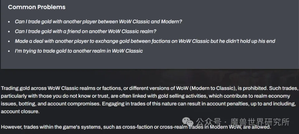 在更新后的支持文章中,暴雪明白指出,跨魔兽天下怀旧服和魔兽天下正式版之间的金币交易举动是克制的。