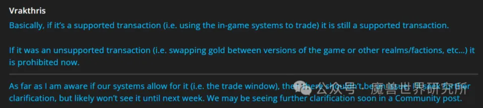 暴雪在开头添加说明,是克制在怀旧服之间跨服跨阵营交易,同时在尾部加入特殊说明,正式服跨服跨阵营交易是被答应的!