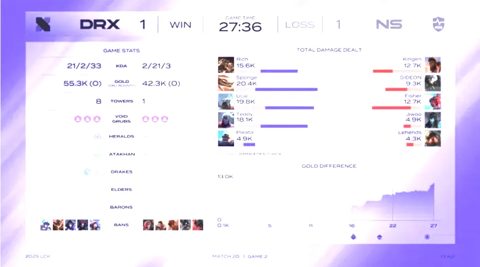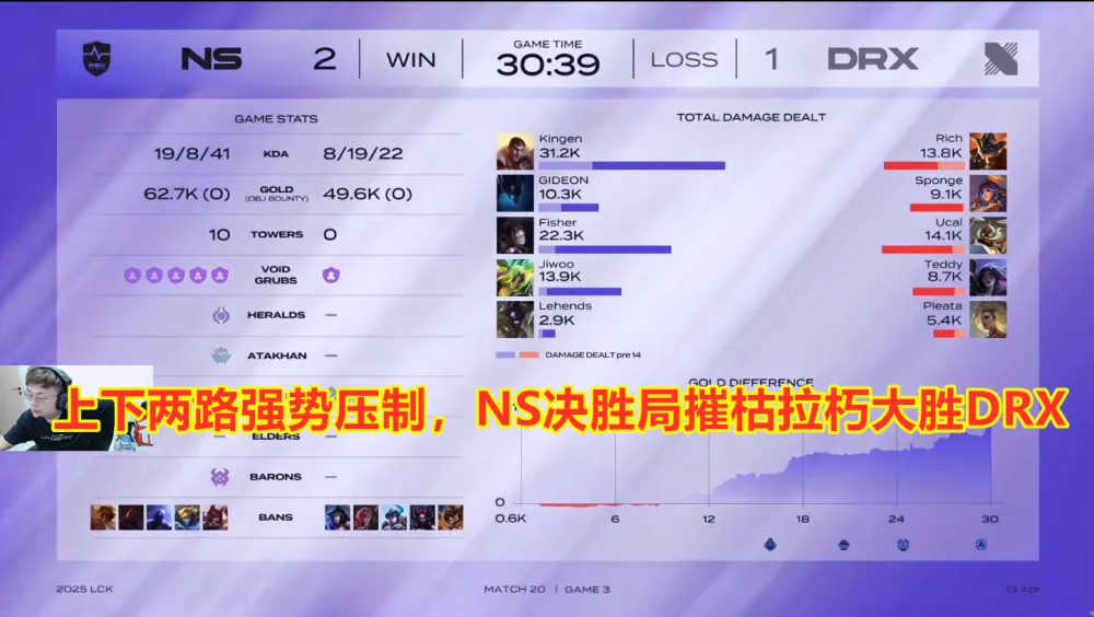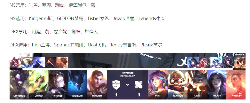 第二阶段第十天的比赛,由DK大战GEN,NS大战DRX两场比赛构成。他们又会打成什么样呢?一起来看一下! 上下两路强势压抑,NS决胜局摧枯拉朽大胜DRX第一局比赛,NS蓝色方,禁用纳亚菲利、杰斯、岩雀、布隆、璐璐,选用格温、波比、阿萝拉、艾希、烈娜塔;DRX红色方,禁用瑟庄妮、蔚、卡莉斯塔、蜘蛛、泰坦,选用安蓓萨、赵信、沙皇、女枪、洛 效果第一局比赛前期,NS依赖上野上风对线打出5k经济差距。比赛第19分钟,NS率先抓掉Sponge赵信,随后野区一连追击打出0换3;比赛第21分钟左右,Kingen格温上演极限反杀,NS二打三打出0换2;终极比赛第31分09秒,NS野区先后打出1换4后结束比赛。 第二局比赛,DRX蓝色方,禁用瑟庄妮、兰博、阿狸、蜘蛛、妮蔻,选用鳄鱼、纳亚菲利、维克托、韦鲁斯、布隆;NS红色方,禁用蔚、杰斯、岩雀、牛头、剑魔,选用奎桑提、蝎子、永恩、卡莉斯塔、泰坦 效果第二局比赛,前10分钟打得比较胶着,经济交替领先,但是到了比赛第16分钟,两队爆发先锋团。Sponge纳亚菲利丝血一打二反杀两人。NS一波先后打出1换4大胜。同时在下路Rich鳄鱼单杀Kingen奎桑提;比赛第20分钟左右,两队爆发厄塔汗团。Ucal维克托爆砍三杀资助DRX一波打出0换4;终极比赛第27分36秒,两队在野区爆发混战,DRX一波打出0换5后结束比赛。 第三局比赛,NS蓝色方,禁用岩雀、塞恩、瑞兹、伊泽瑞尔、霞,选用杰斯、梦魇、发条、泽丽、牛头;DRX红色方,禁用阿狸、蔚、瑟庄妮、蜘蛛、炸弹人,选用兰博、莉莉娅、飞机、韦鲁斯、芮尔 效果第三局比赛,NS上下两路都站了出来,比赛中从一开始,就打出了压抑。15分钟以后,就是一路碾压,压抑得DRX完全没有还手之力。终极30分39秒,NS一路平推,得到胜利。 终极NS三局战胜世界冠军DRX,算是拿到了胜利;而DRX则是一败再败,毫无世界冠军的尊严,可怜可叹啊! |