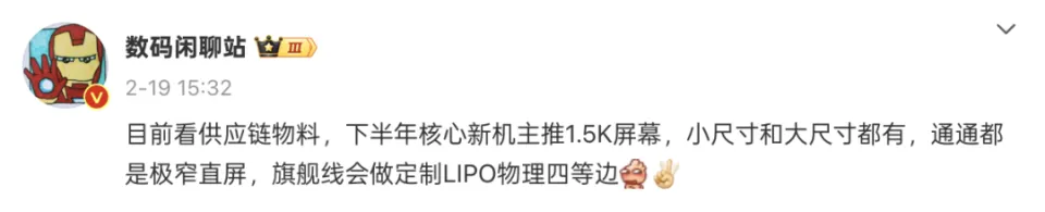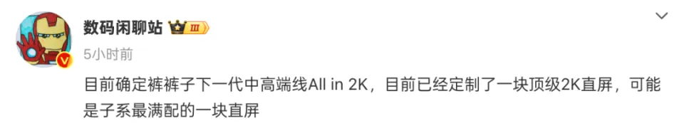 但云云倒反天罡的设置,天然也没能留到下一代。 在 iQOO 13 上,刚塞满的影像又砍了归去。 但换来了 2K 直屏、超声波指纹、大要积双扬和马达等等一系列周边设置。 看到这,大伙找到规律了吗? 在 iQOO 尺度版旗舰上,2K 屏和影像设置。 好像就跟山里的两只老虎、肠粉和榴莲、广东人和福建人一样…没办法共存。 而到了接下来的 iQOO 15… 如许尴尬的环境就不会再出现喽~ 啊对了,这次跳过了名字 8 太好听的 iQOO 14,直接快进到 iQOO 15 系列。 履历短暂的“一部即全部“后,iQOO 15 系列大概又会重回双杯打法。 尺度版和 Pro 的区别,这会儿还不太清楚。 但起首可以确定的是,全系 2K 直屏。 而且还不是一样平常的那种嗷,听说是子系最满配的一块直屏,按照以往的爆料来看,供应商大概来自大洋彼岸的三星。 高定三星 2K 屏…嗯,让我想起了当年的 OPPO Find X6 Pro。 素质确实挺不错。 总之,iQOO 15 系列的屏幕可以期待一下,感觉会有惊喜。 固然如果能给 X300 系列都安排上的话那就更好了。 而且,之前 iQOO 产物司理也已经确认。 以后包括大杯 Pro 在内的数字旗舰,全部都是直屏。 不想用曲面屏的机友,也大可放心。 性能方面,同样全系搭载骁龙 8E2。 电池同样是 7000mAh+++,支持 120W 有线快充,无线充电大概率也会在大杯上回归。 别的潜望镜、超声波指纹、大要积马达、大要积双扬声器也全都有。 至于尺度版会不会上潜望,目前还没定,但根据爆料来看应该都是有的。 代价部门嘛,尺度版估计照旧 3999 元起步。 大杯参考 iQOO 12 Pro,16+256GB 4999 元。 但考虑到这代,去掉了资源极高的广域超声波指纹,加上大概会降低到 12GB 内存起步。 机哥盲猜一波 4699 元起。 欧克,以上就是年根本品牌的两款 2K 直屏旗舰。 固然啊,说是年底也不完全对。 今年旗舰芯片发布日期,又双叒全面提档。 K90 系列和 iQOO 15 系列,不出意外的话会定在今年 10 月。 就目前看来。 K90 Pro 和 iQOO 15 这两台机子都挺水桶的。