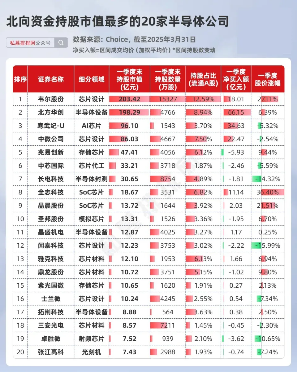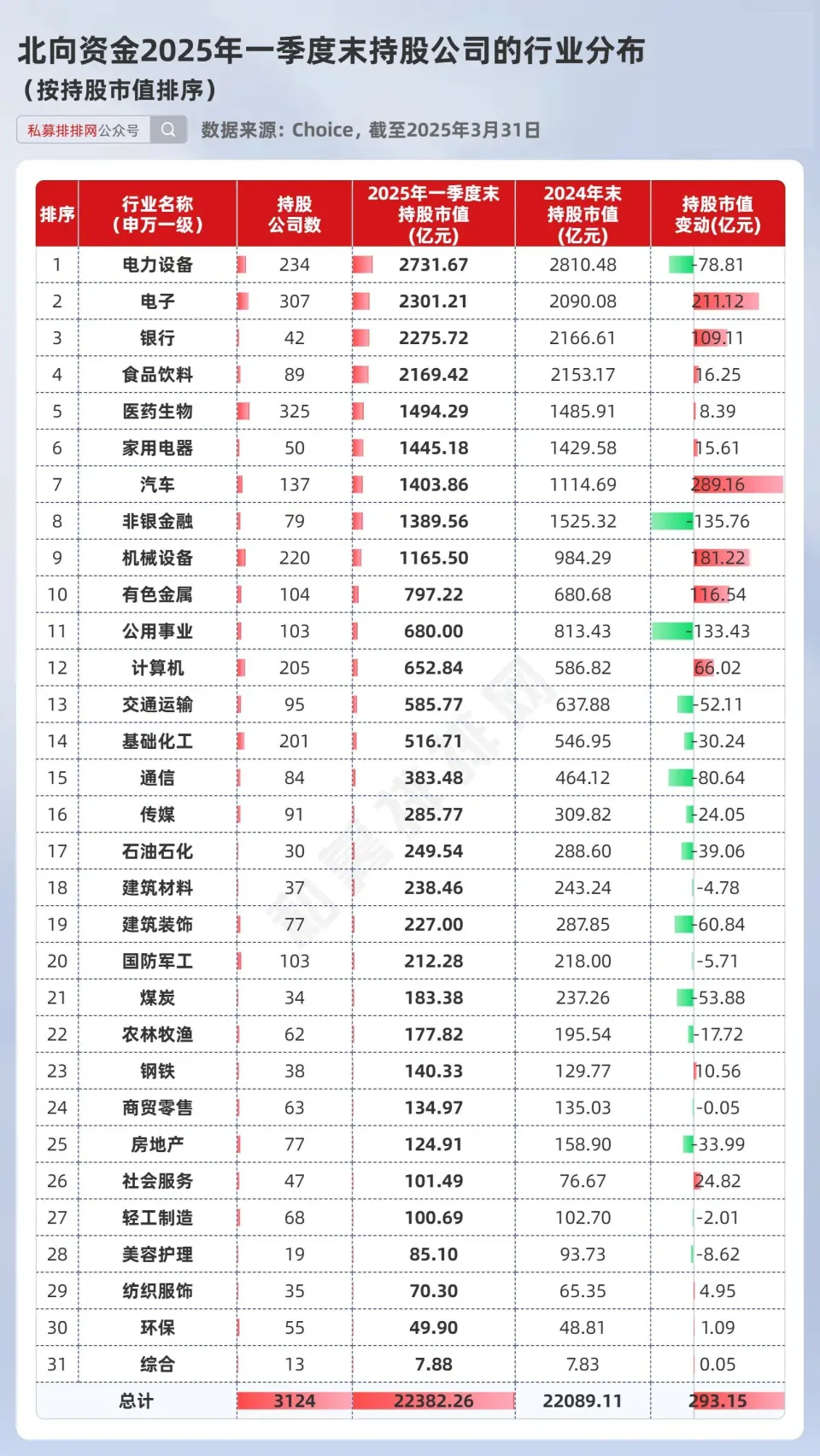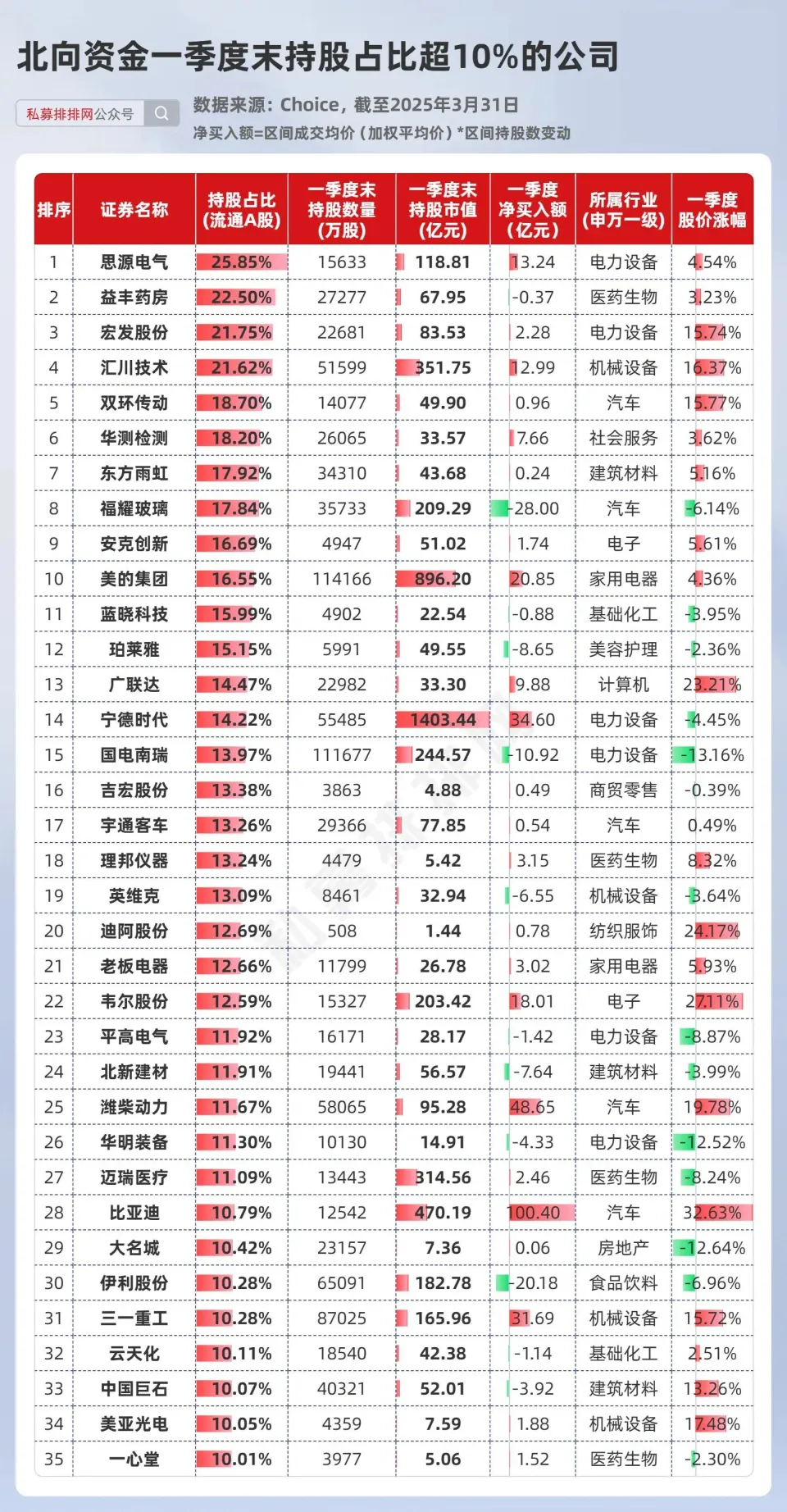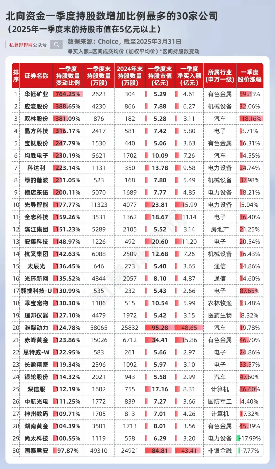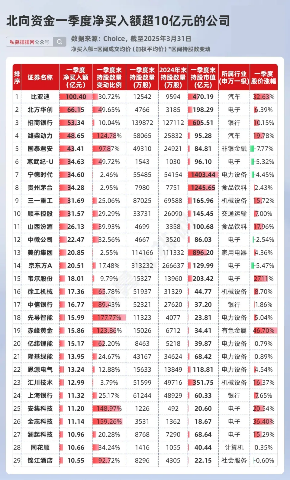 近日,备受市场关注的北向资金(外资为主)最新持股数据(2025年一季度末)出炉了。根据数据统计,停止2025年3月31日收盘,北向资金持股的A股公司共有3124家,持股总市值约为22382亿元,相比2024年末的22089亿元,增长了约293亿元。 北向资金被很多投资者奉为“聪明资金”,是A股市场一个不可忽视的力气,也是很多投资者的参考指标。下面,笔者就从多个维度为各人分析北向资金的最新持股情况和持股动向。 16家半导体公司被北向资金持股均超10亿! 起首,从北向资金持股的行业分布(申万一级行业)来看,2025年一季度末,北向资金对电力装备、电子、银行、食品饮料等4个行业的持股市值均在2000亿元以上,此中持股市值最多的行业为电力装备(包罗锂电、光伏、风电等细分行业),持股市值超2700亿元。而对医药生物、家用电器、汽车、非银金融、机械装备等5个行业的持股市值均为1000多亿元。 从北向资金的个股持股市值来看,2024年末北向资金持股市值超100亿的A股公司有34家,根本上都是各个行业的龙头公司。此中银行占6家,电子行业(包罗半导体、消费电子、光学光电子)占5家,食品饮料行业占4家。 此中,2025年一季度末,北向资金第一大重仓股是宁德期间,持股市值超1400亿元,一季度净买入约34.60亿元。第二大重仓股为贵州茅台,持股市值超1245亿元,一季度净买入约34.28亿元。 从市场表现来看,北向资金持股超100亿元的公司,在本年一季度的股价涨幅中位数为0.84%,跑赢同期上证指数的涨幅(-0.48%)。此中,领涨个股为比亚迪,其在一季度涨幅靠近33%,北向资金持有该股市值约为470亿元。 近期,受国产替代逻辑驱动,半导体板块表现强势。半导体作为电子板块中紧张的构成部分,电子板块又是北向资金第2大重仓的行业,北向资金也重仓多家半导体公司。 为此,笔者特梳理出了北向资金持股市值最多的20家半导体公司。此中,北向资金持股市值超10亿元的半导体公司有16家,持股市值最多的是韦尔股份,持股超203亿元;其次是北方华创,持股超198亿元。 从北向资金持股占流畅A股的比例来看,根据数据统计,2025年一季度末,北向资金持股占比超10%的公司有35家。此中,电力装备行业占6家,汽车行业占5家,机械装备行业和医药生物行业各占4家。北向资金持股占比超20%的公司有思源电气、益丰药房、宏发股份、汇川技能等4家公司。 从市场表现来看,北向资金持股占比超10%的公司,在本年一季度的股价涨幅中位数为3.62%,跑赢同期上证指数的涨幅(-0.48%)。此中,涨幅超10%的占11家。 29家公司一季度被北向资金加仓超10亿元!北向资金大幅加仓个股表现亮眼! 从本年一季度北向资金的动向来看,有29家A股公司被北向资金净买入超10亿元。此中,电子行业占8家,电力装备行业占5家,银行和机械装备行业各占3家。 净买入额根据“净买入额=(2025年一季度末持股数-2024年末持股数)*一季度成交均价(加权均匀值)”估算。 本年一季度,北向资金净买入额最高的是比亚迪,净买入额超100亿元,该股一季度涨幅为32.63%。北向资金对比亚迪的持股数由2024年末的9594万股增长到了2025年一季度末的12542万股,持股数增长约30.72%。 从市场表现来看,北向资金加仓超10亿元的公司,在本年一季度的股价涨幅中位数为6.39%,跑赢同期上证指数的涨幅(-0.48%)。此中,涨幅超20%的占5家。 从持股变更比例来看,本年一季度,北向资金大幅加仓多只个股。为了给读者提供更好的参考,笔者在“2025年一季度末北向资金持股市值超5亿元”的公司中梳理出了2025年一季度末持股数相比2024年末增长比例最多的30家公司。此中,电子行业占6家,汽车、有色金属、电力装备等行业各占4家。北向资金持股增幅在200%以上的公司有9家。 从市场表现来看,北向资金加仓比例最高的30家公司,在本年一季度的股价涨幅中位数为20.16%,大幅跑赢同期上证指数的涨幅(-0.48%)。此中,涨幅超30%的占11家。 别的,笔者还梳理出了一季度北向资金净卖出超10亿元的公司,共有25家。此中,通讯行业占4家,电子、家用电器行业各占3家。 从市场表现来看,北向资金净卖出超10亿元的公司,在本年一季度的股价涨幅中位数为-5.19%,跑输同期上证指数的涨幅(-0.48%)。 数据阐明 本文信息及数据泉源于公开资料及外部数据库等,本平台无法对其真实性、正确性、完备性作出实质性判定和包管,分析结论仅供参考,所涉及品种均不构成现实投资操纵发起。投资有风险,选择需审慎。 风险展现 本文所涉的文章观点,仅代表笔者个人观点,不代表本平台的任何态度,不构成任何股票保举及投资发起。 版权声明:未经许可,任何个人或机构不得进行任何情势的修改或将其用于商业用途。转载、引用、翻译、二次创作(包罗但不限于以影音等其他情势显现作品内容)或以任何商业目标进行使用的,必须取得我司许可并注明作品泉源为私募排排网,同时载明内容域名出处。 北向资金 |