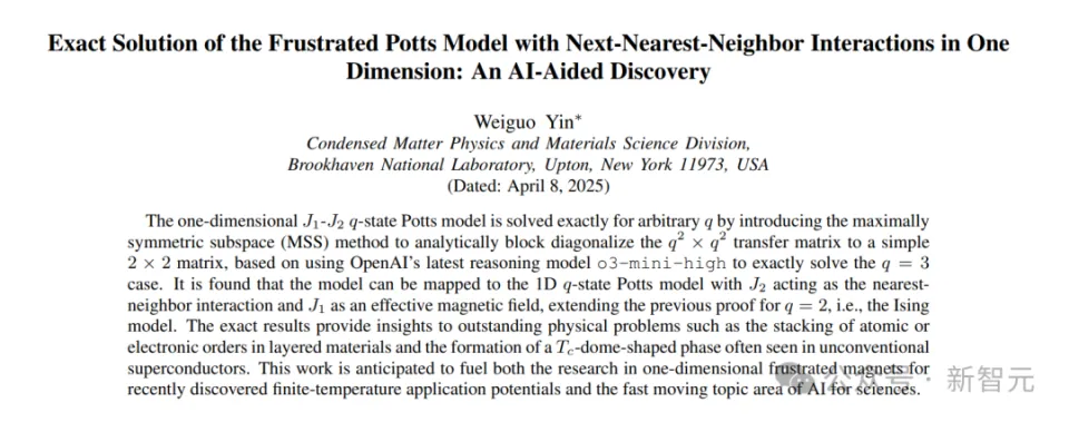 新智元报道 【新智元导读】AI辅助人类,完成了首个非寻常研究数学证明,破解了50年未解的数学难题!在南大校友的研究中,这个难题中q=3的环境,由o3-mini-high给出了正确解。就在刚刚,AI完成了首个非寻常研究数学证明! 完成这项研究的,是美国纽约布鲁克海文国家实验室凝结态物理与质料科学分部的一位华人学者Weiguo Yin。 论文地点:https://arxiv.org/abs/2503.23758 在这项研究中,作者在一维J_1-J_2 q态Potts模子,通过引入最大对称子空间(MSS)方法,对其正确求解。 具体来说,作者将q^2×q^2的传递矩阵举行块对角化。 而q=3的环境,正是基于OpenAI的最新推理模子o3-mini-high来正确求解的。 在AI的资助下,研究者成功证明,模子可以映射为一维q态Potts模子,此中J_2作为近来邻相互作用,J_1则作为有效的磁场,这一结果扩展了之前在q=2,即Ising模子的证明。 留意,这个标题,在数学界有50年没有解决。 论文引用了关于J_1J_2伊辛模子(即q=2的Potts模子)的工作,这些工作可以追溯到1969年和1970年。 而o3-mini-high帮助完成的这项证明,为浩繁悬而未决的物理标题(层状质料中原子或电子次序堆叠的标题,以及非通例超导体中常见的T_c-拱形相的形成等),提供了全新的看法。 AI模子在科学研究中的巨大潜力,也再一次被证明! Weiguo于2004年加入布鲁克海文国家实验室继承研究员,并于2006年提升为助理物理学家,2008年提升为副物理学家,2011年提升为物理学家。 他的专长在于联合第一性原理、有效哈密顿量和呆板学习方法,研究强关联体系、挫败磁性、超导性、多铁性、混合的3d-5d化合物、拓扑质料和非均衡态。 1998年,他得到南京大学的博士学位,并荣获2000年国家良好博士学位论文奖。 在凝结态物理、质料科学、量子信息学和微电子学等研究范畴中,发现新的相和相变是一个核心挑衅。 挫败磁体中存在很多不寻常的相,这些磁体通常用伊辛模子(Ising model)或量子海森堡模子(quantum Heisenberg model)来形貌。 统计力学的第三个根本模子是q状态Potts模子。 它是伊辛模子(q=2)的推广,可以作为研究从离散(伊辛)对称性到连续(海森堡)对称性转变的有效中介。 特别是,一维J_1-J_2 Potts模子可能与浩繁标题相干,这些标题涵盖了从层状质料中原子或电子有序的面外堆叠,如1T-TaS_2 中的「大卫之星」电荷密度波,到每个时间步都有多种选择的时间序列标题,如乒乓球训练计划。 1T-TaS2中的「大卫之星」电荷密度波相干论文插图 只管一维和二维的J_1-J_2伊辛模子和海森堡模子已被广泛研究,但只有一维J_1-J_2伊辛模子通过转移矩阵法得到了正确解。 对于一维J_1-J_2 Potts模子,至今仍没有正确的剖析解。 由于当q=3时,该模子已经显现出与q=2(即伊辛模子)差别的基态相活动(见下图),因此正确求解恣意q的模子具有根本性的重要性。 q=2和q=3:差别的基态相活动 挑衅在于转移矩阵的阶数敏捷增长,阶数为q^2。 可想而知,q=3时的9×9矩阵已经很难举行剖析求解,而q=10^10时的10^10×10^10矩阵,纵然是数值盘算也无能为力。 先前的研究将任务转化为数值盘算有效的q×q矩阵,接纳整数q情势的转移矩阵法,或连续q情势的转移矩阵。 只管物理学的透明度较低,但仍旧无法得到正确的剖析结果。 因此,对于一维J_1-J_2 Potts模子,至今仍旧缺乏此中丰富相活动的直观明确。 近来的两个发展为这一恒久未解标题提供了新的视角。 第一个发展是通过基于对称性的块对角化,将装饰伊辛梯形的4×4转移矩阵简化为有效的2×2矩阵。 这些发现为一维挫败Potts模子找到正确解,可能成为这一重要新方向的里程碑。 第二个发展是OpenAI最新的推理模子o3-mini-high,推导出了一个优雅的方程,在外部磁场下,可以确定装饰伊辛模子中UNPC的临界温度。 论文链接:https://arxiv.org/abs/2502.11270 因此,作者受到开导,徐徐提示AI推理模子,行止理整数q情势的转移矩阵。 只管AI的答复中有不少错误,针对q=3的环境,终极找到了一种基于对称性的块对角化方法,可以将一维J_1-J_2三状态Potts模子的9×9转移矩阵剖析地简化为有效的2×2矩阵。 对于一样平常的q,关键的对称性是q个Potts状态的全分列对称性。 换句话说,哈密顿量(因此在整数q情势中的转移矩阵)在任何对标签{1,2,3,...,q}的分列下都是稳固的;它的对称群是Sq。 固然AI未能进一步推进,但告诫说随着q的增大,分列的数量急剧增长。 然而,q=2和q=3的正确结果,特别是两者都归结为2×2矩阵,开导了作者: 由于在热力学极限下只有转移矩阵的最大特征值(λ)才重要,因此任务简化为辨认包罗λ的对称分离子空间。 随后,作者发现这个子空间由两个最大对称向量张成,由于全部转移矩阵元素都是正的,这使得终极得到了一个剖析的2×2矩阵。 因此,恣意q的一维J_1-J_2 Potts模子的正确解,就这样被找到了,而且过程出奇的简朴! 下面我们就来看看,o3-mini-high是如安在这项研究中推导出关键方程,对q=3的环境正确求解,从而确定了装饰伊辛模子中UNPC的临界温度的。 起首,o3-mini-high证明,根据其知识,1D J_1-J_2 Potts模子尚未被正确求解。 接着,模子被提示使用1D J_1-J_2三态Potts模子的之字形梯形版本。 在这种环境下,AI正确地给出了以下哈密顿量表达式: 随后,AI正确地天生了以下传递矩阵的表达式。 此中,(a, b)是由一对自旋组成的「梯级」状态,(a', b')是相近梯级状态。 假设一组梯级状态按以下次序分列:(1, 1), (1, 2), (1, 3), (2, 1), (2, 2), (2, 3), (3, 1), (3, 2), (3, 3)。 若使用简