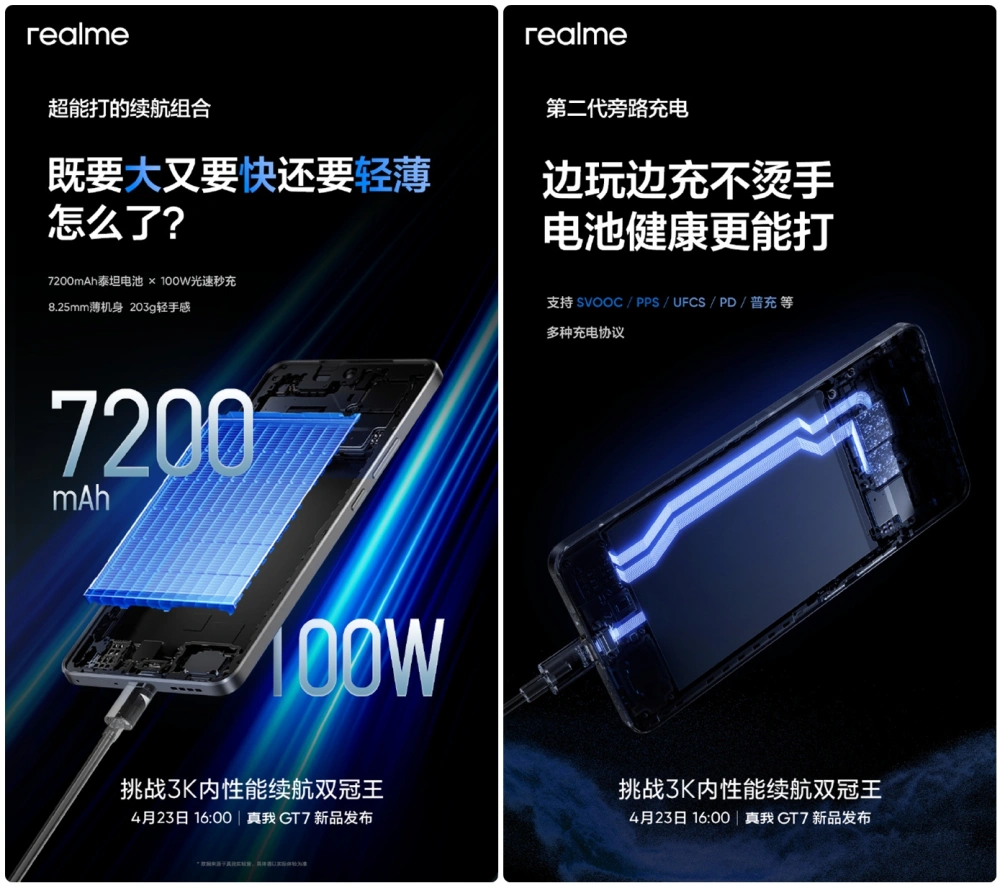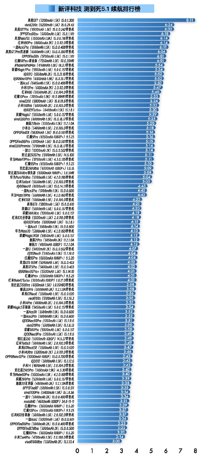 4月14日,【真我GT7】的电池、厚度和重量信息都公布了:7200mAh电池+100W快充,重量203克,8.25mm厚。 作为首台有巨型电池的天玑9400/骁龙8至尊版机型,真我GT7在新评科技的续航测试中↓,刷出了大幅抛离第二名的成绩(但提升过于巨大,总感觉那边不短冖)。 【真我 GT 7】RMX6688,现有爆料汇总: