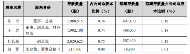 世名科技9月1日公告,公司董事会于9月1日收到董事、总裁陈今,董事、副总裁、财政总监王岩,副总裁杜长森,副总裁、董事会秘书赵彬出具的《关于苏州世名科技股份有限公司股份减持筹划的告知函》,彼等拟合计减持不超151.93万股,占公司总股本的0.56%。 停止公告披露日,陈今持有198.85万股,占公司总股本的0.74%;王岩持有199.21万股,占公司总股本的0.74%;杜长森持有202.96万股,占公司总股本的0.75%;赵彬持有21.75万股,占公司总股本的0.08%。 |