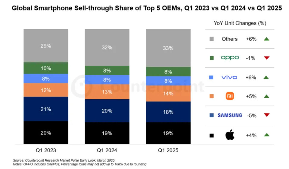 2023、2024、2025第一季度全球Top 5智能手机厂商销量份额对比Counterpoint IDC的数据表现,2025年第一季度中国市场智能手机的出货量连续了已往五个季度的增长趋势,同比增长3.3%,达7160万部。增长的重要动力来自于中国政府实行的“国补”政策和春节贩卖旺季的双重拉动。然而IDC指出,2025年中国智能手机市场仍将面临来自国际地缘政治和宏观经济环境的压力。 这家机构给出的陈诉表现,小米、华为、OPPO、vivo和苹果,位列中国前五,此中苹果出货量大幅下滑9%,也是前五名中唯一下滑的厂商。