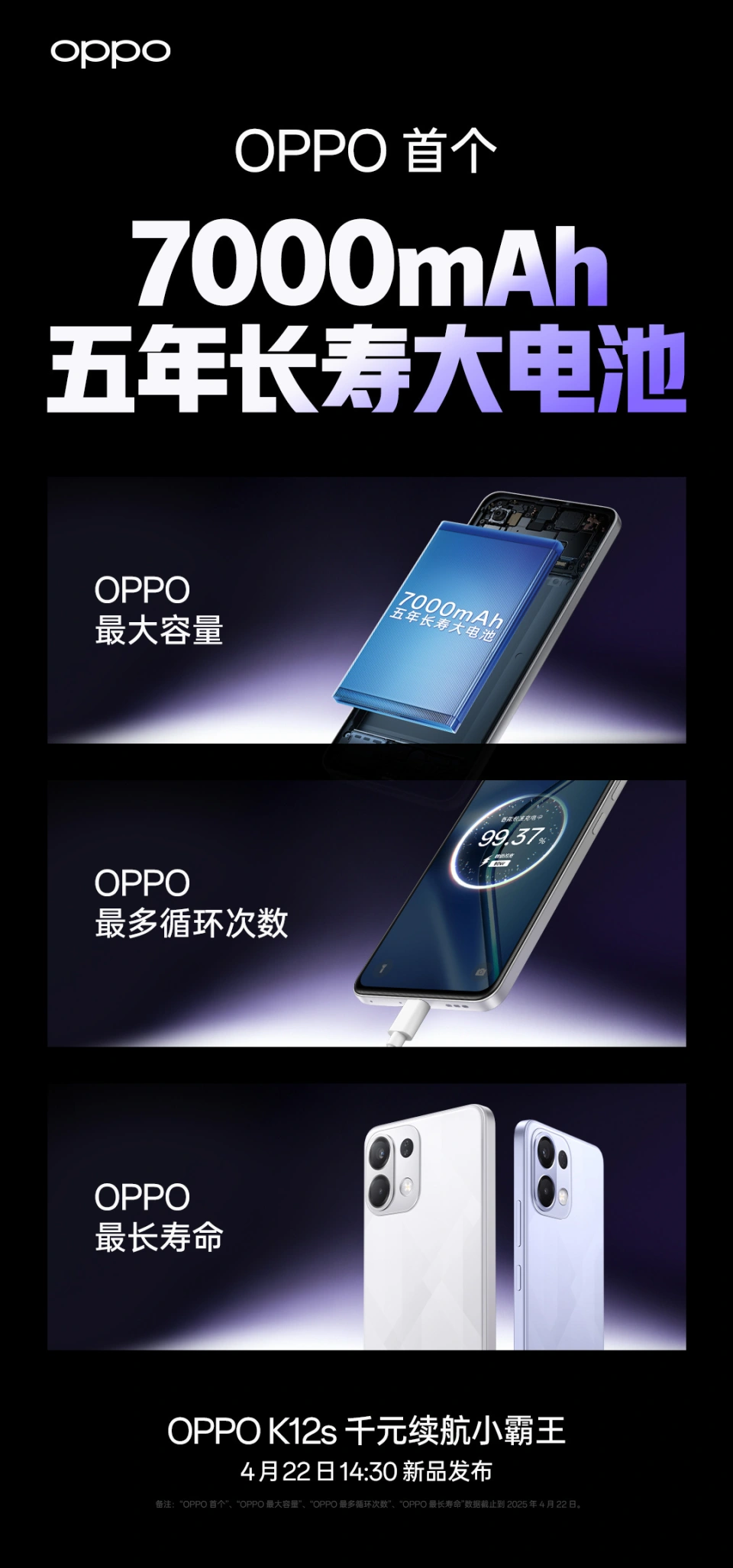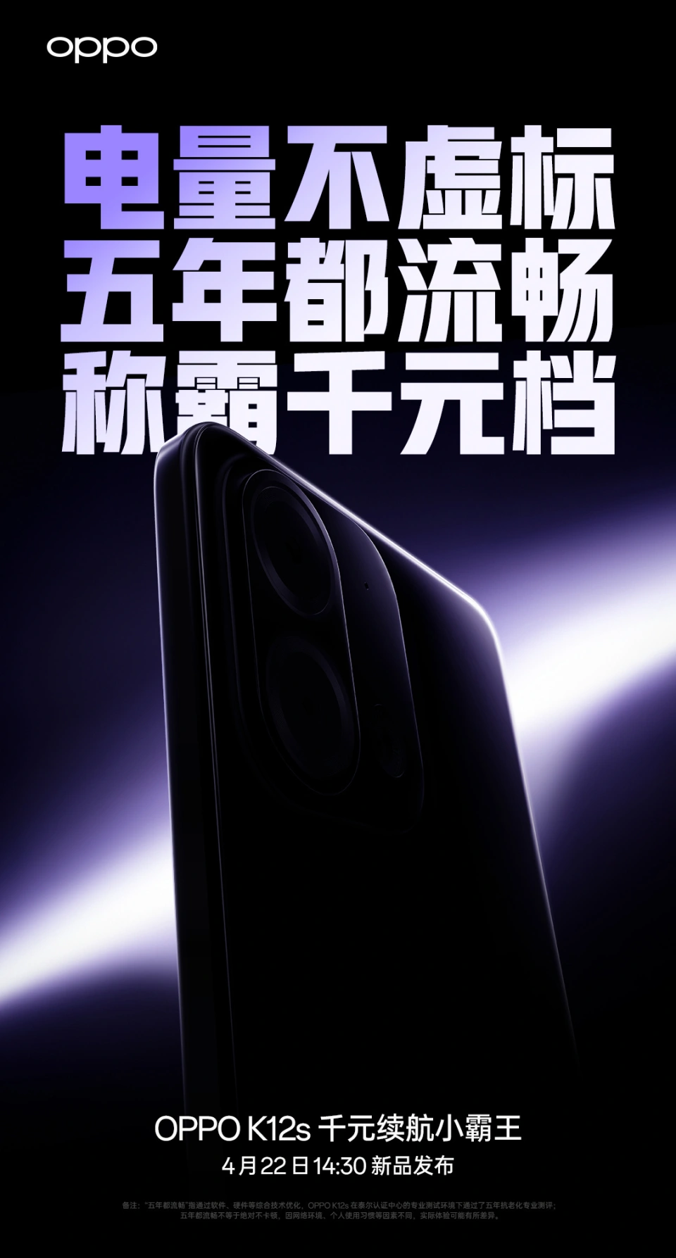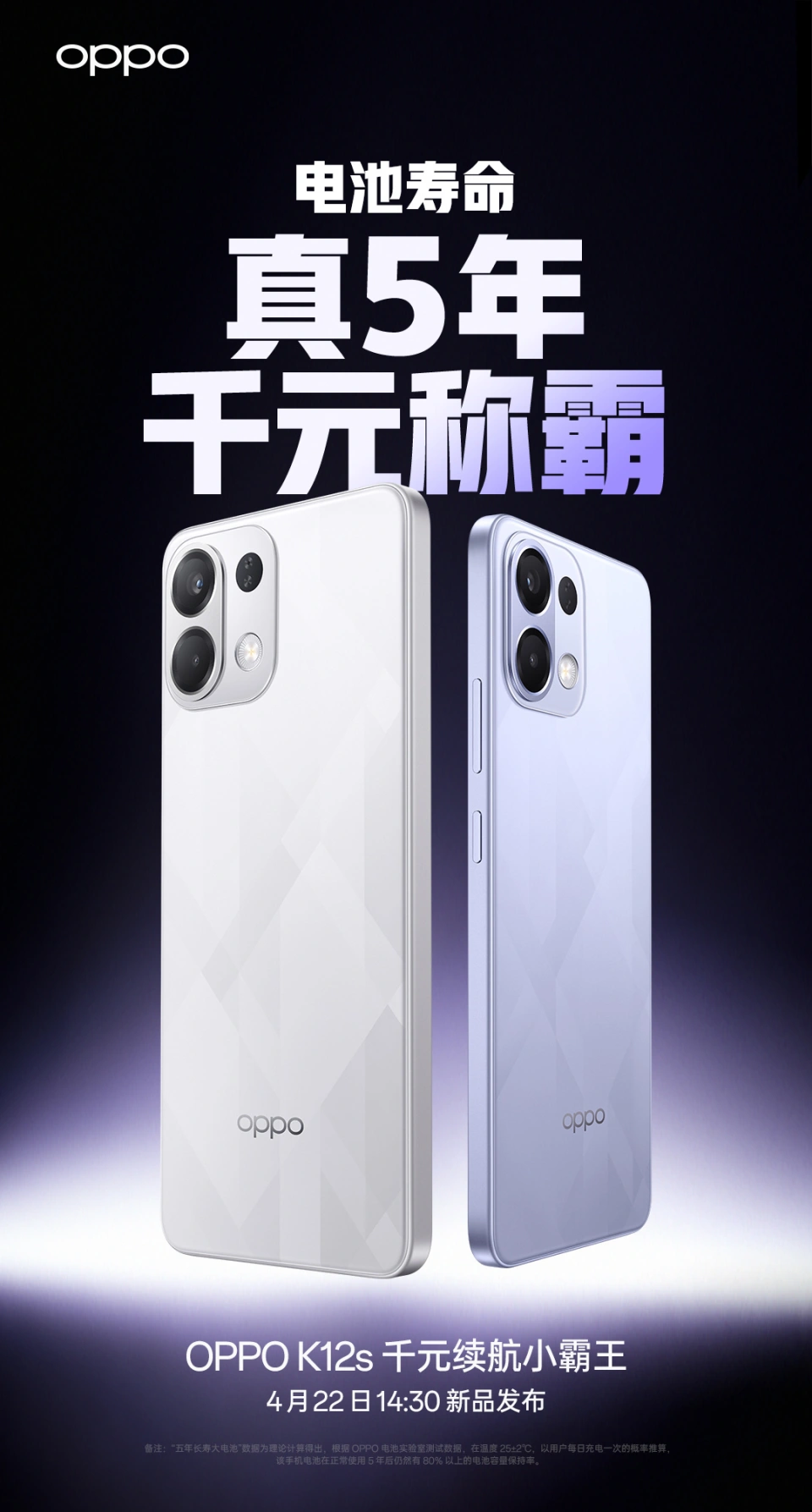 IT之家 4 月 17 日消息,OPPO 本日官宣 OPPO K12s 手机新品,号称是“千元续航小霸王”,将于 4 月 22 日 14:30 发布。 OPPO K12s 搭载 OPPO 首个 7000mAh 五年长寿大电池,实现 OPPO 最大容量、最多循环次数、最长寿命,支持电池循环 1800 次、电池寿命 5 年。 从海报可以看到,OPPO K12s 配有后置圆角矩形镜头模组,接纳直角中框,后盖还有棱形纹理操持,可选两个配色。 博主@数码闲聊站 本日爆料称: