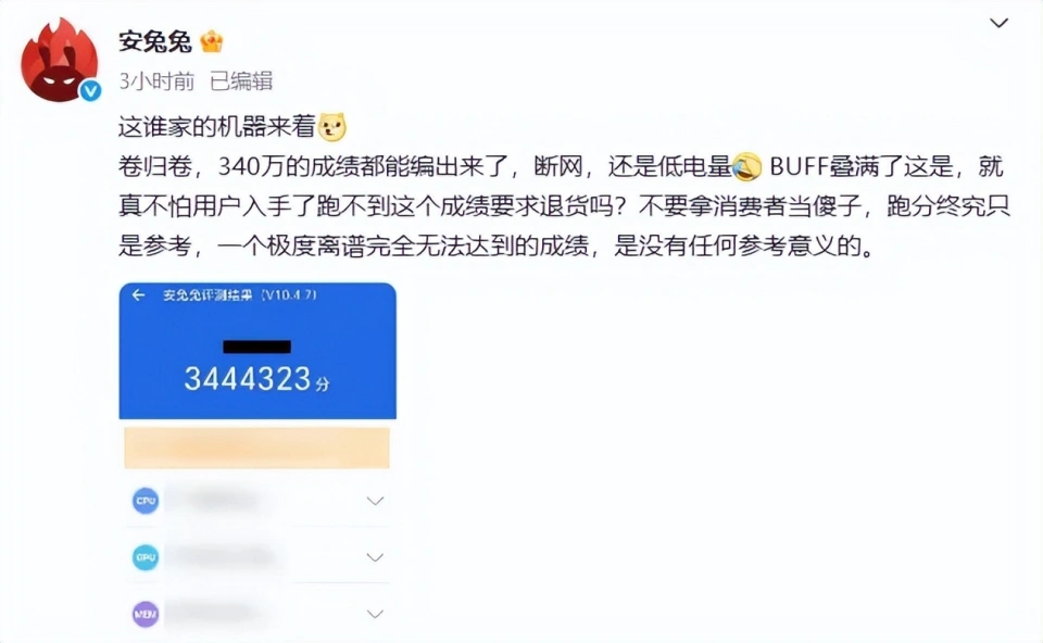 本日网上传播的一张安兔兔跑分图引发了网友们的热议。因由是有爆料称,“某即将登场的直屏性能机,跑分革新到340W+”,并晒出了该机的安兔兔跑分截图。 截图表现其安兔兔跑分综合成绩为3444323分,单纯从跑分来看,如果真实成绩,那么这款新机当之无愧的是“宇宙第一”了。 要知道,根据按照安兔兔前不久公布的3月性能排行榜,如今排在榜首的是,vivo X200 Pro卫星通讯版,均匀跑分290万分,骁龙8至尊版机型体现最强的是iQOO 13,均匀跑分在288万分。而即便是这个月刚发布的天玑9400+,也没有跑出340万分。 由于截图隐去了具体型号、子项目成绩和温度情况,以是,我们既无法判断究竟是哪款机型,或其性能平台。正当大家纷纷推测这款即将登场的直屏性能机究竟是哪家的时间,没想到安兔兔官方起首坐不住了。 安兔兔官方发文质疑称:“卷归卷,340万的成绩都能编出来了,断网,照旧低电量BUFF叠满了这是,就真不怕用户入手了跑不到这个成绩要求退货吗?不要拿斲丧者当傻子,跑分终究只是参考,一个非常离谱完全无法到达的成绩,是没有任何参考意义的。” 从这一回应来看,安兔兔并不承认这一成绩,纵然这是真实存在的,那么也是通过作弊的本领实现。 究竟上,本年以来,各厂商在预热新机的时间,都越来越喜欢卷安兔兔跑分。尤其是4月中下旬即将迎来新一轮的性能手机发布潮,利用跑分预热的情况不会少。就此来看,这款新机号称344万的安兔兔跑分确实是过于离谱了。如今安兔兔官方都看不下去亲自了局手撕,机圈无脑卷跑分的征象该消停了。 |