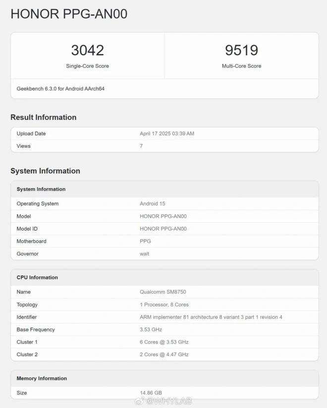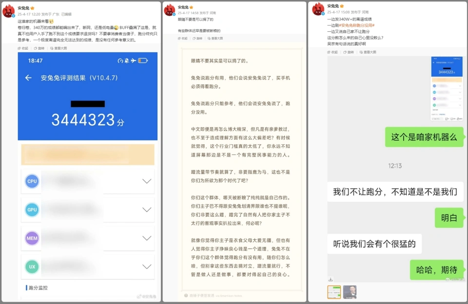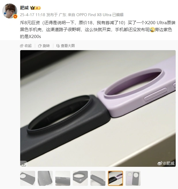 4月17日,GeekBench和安兔兔上都出现了骁龙8至尊领先版新机的跑分。 这台型号为PPG-AN00的光彩新机,应该就是即将在4月23日发布的光彩GT Pro。 其搭载4.47GHz的骁龙8至尊领先版,CPU频率和三星用的骁龙8至尊版for Galaxy同等,GeekBench结果也和三星S25 Ultra接近。 PS:骁龙8至尊版for Galaxy(SM8750-AC)是“超等内核”提到4.47GHz,GPU从1.1GHz→1.2GHz。25-0123由三星Galaxy S25系列首发。 同日还有光彩GT Pro的安兔兔跑分出炉,是革新纪录的344万分。然后就看到下面的微博了。 安兔兔3连发↓ 光彩GT系列产品司理杜雨泽↓(确认是低温测试) 可以明确安兔兔想维护跑分参考性的积极(不盼望有冰箱跑分),但看得出,微博运营确实是血气方刚。 4月17日,vivo放出vivo X200 Ultra的官方整机图,而肥威老师也放出斥巨资买入的X200 Ultra官方壳↓(戴上手机壳,看着就没有那么突兀了)。 4月17日,OPPO K12s ↑官宣将在4月22日发布,号称“千元续航小霸王”,7000mAh电池+80W快充,宣称1800次循环后剩余容量大于80%,新的设计语言,比一加13T还早2天发布。 同日,闲聊站有对应的爆料:OPPO K12s是新的骁龙芯片、超过5700平方毫米的VC均热板、NFC+红外+双扬,直屏,7000mAh电池+80W快充。 光彩X60 GT也在4月17日官宣并放出真机图↑,其将在4月22日发布,宣称是“骁龙旗舰芯”(骁龙8s Gen 4或骁龙8 Gen 3?),6300mAh青海湖电池。 |