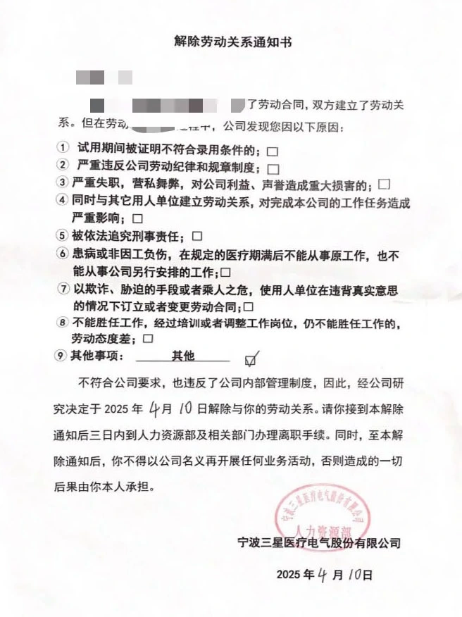 一份来自宁波三星医疗电气股份有限公司(下称“三星医疗”)的《排除劳动关系关照书》表现,其发给员工的裁员缘故起因是“其他”,并要求员工三日内办理离职手续。 必要指出的是,这里的“三星”与广为人知的科技巨头三星团体并无任何关联,而是奥克斯创始人、董事长郑坚江从前间赖以起家而创建的电表产物品牌,后随着奥克斯进军医疗东西范畴而更名为“三星医疗”。 天眼查表现,三星医疗为奥克斯团体控股子公司,实控人郑坚江。